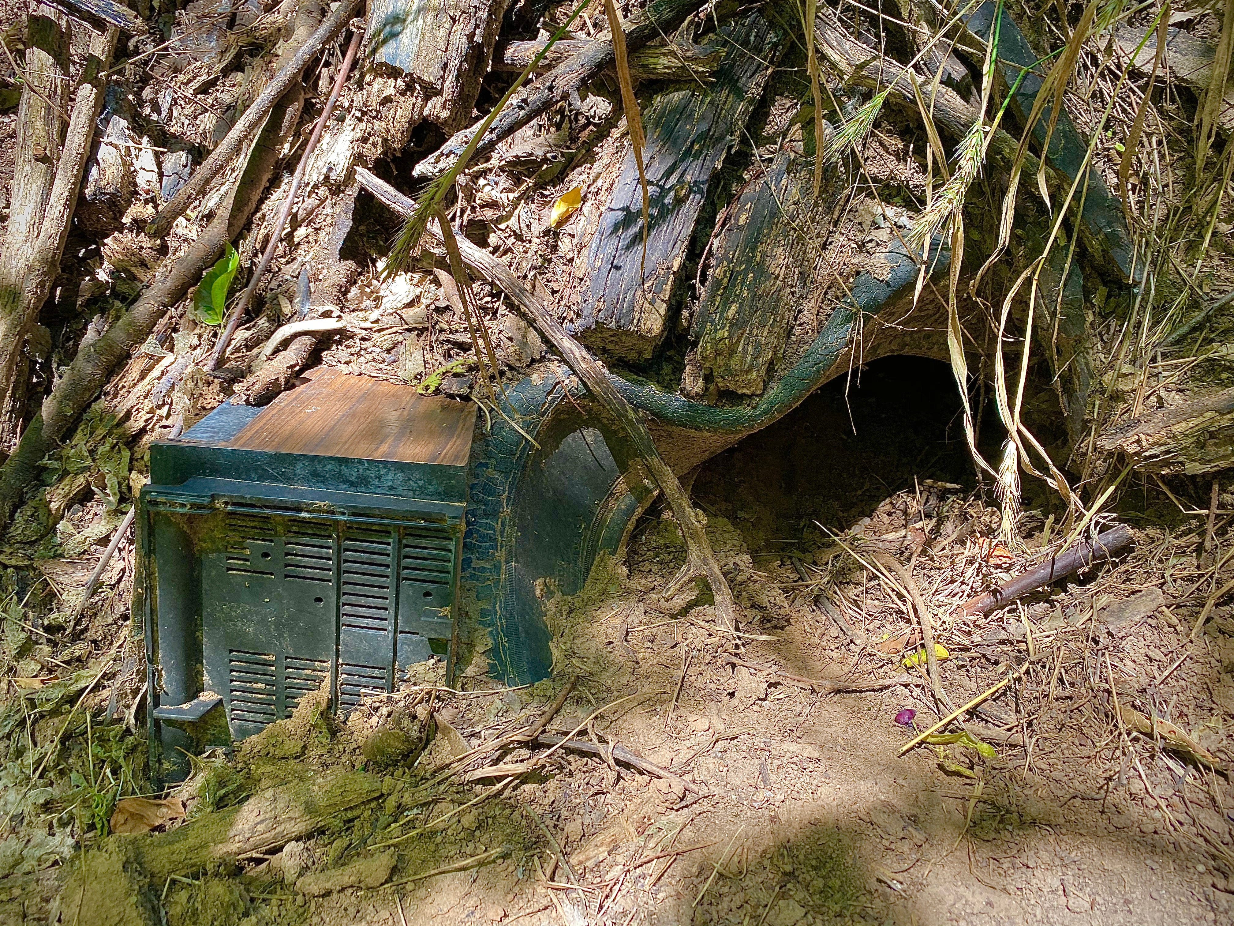 [Pic: animal burrow found Saturday in the ravine of trash, made from an old tire and a 1970s color television]