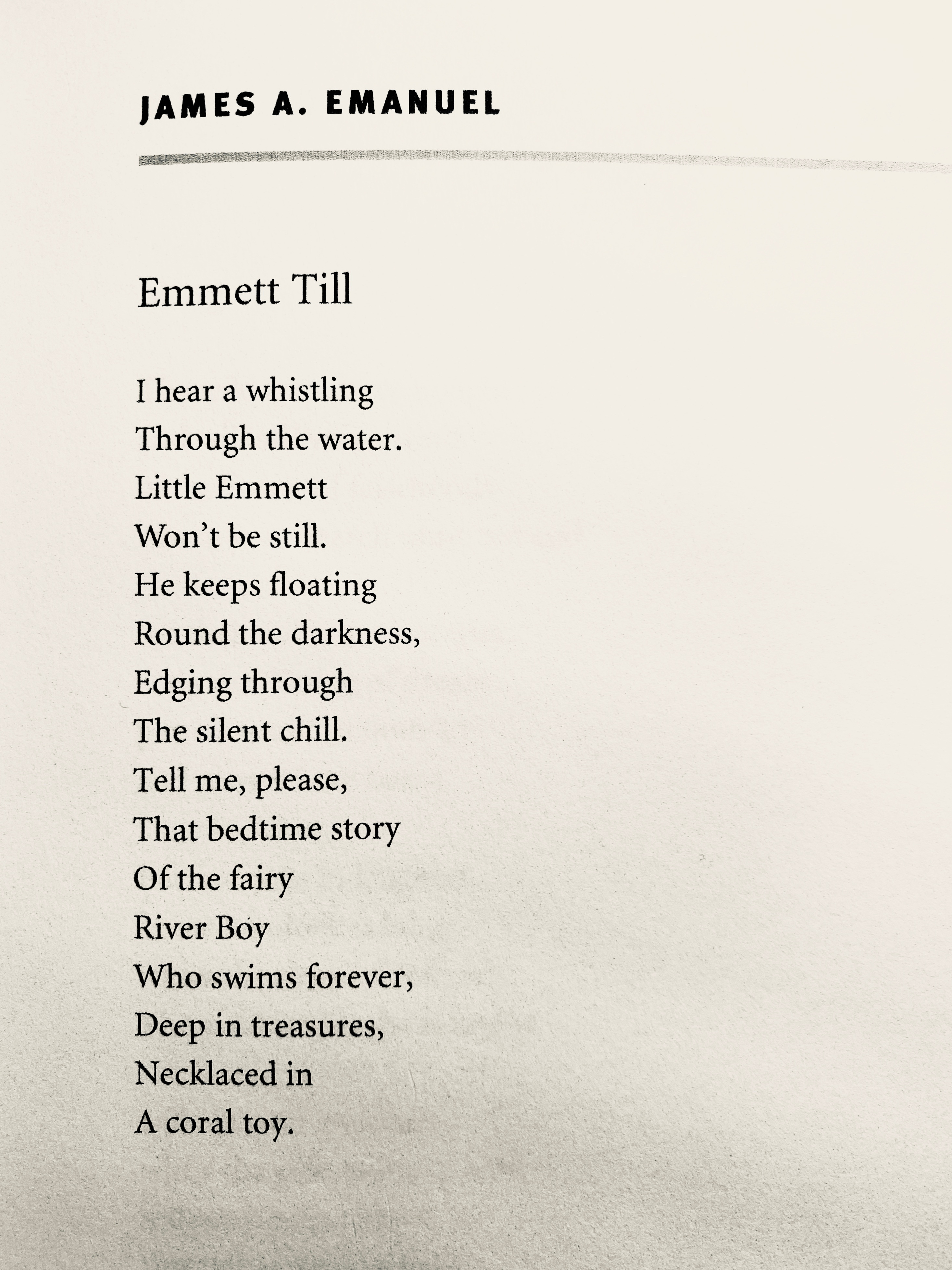 Thanks to all of you who shared last week’s newsletter focused on nature writing by black authors, and helped that be the most widely read issue of Field Notes thus far. I hope to continue to feature such voices, in the hopes that you will check them out. Monday’s mail brought me a copy of Black Nature: Four Centuries of African American Nature Poetry, edited by Camille Dungy. Here’s one poem that stuck with me, a remembrance of Emmett Till in dark romantic verse, by James A. Emanuel (1921-2013).