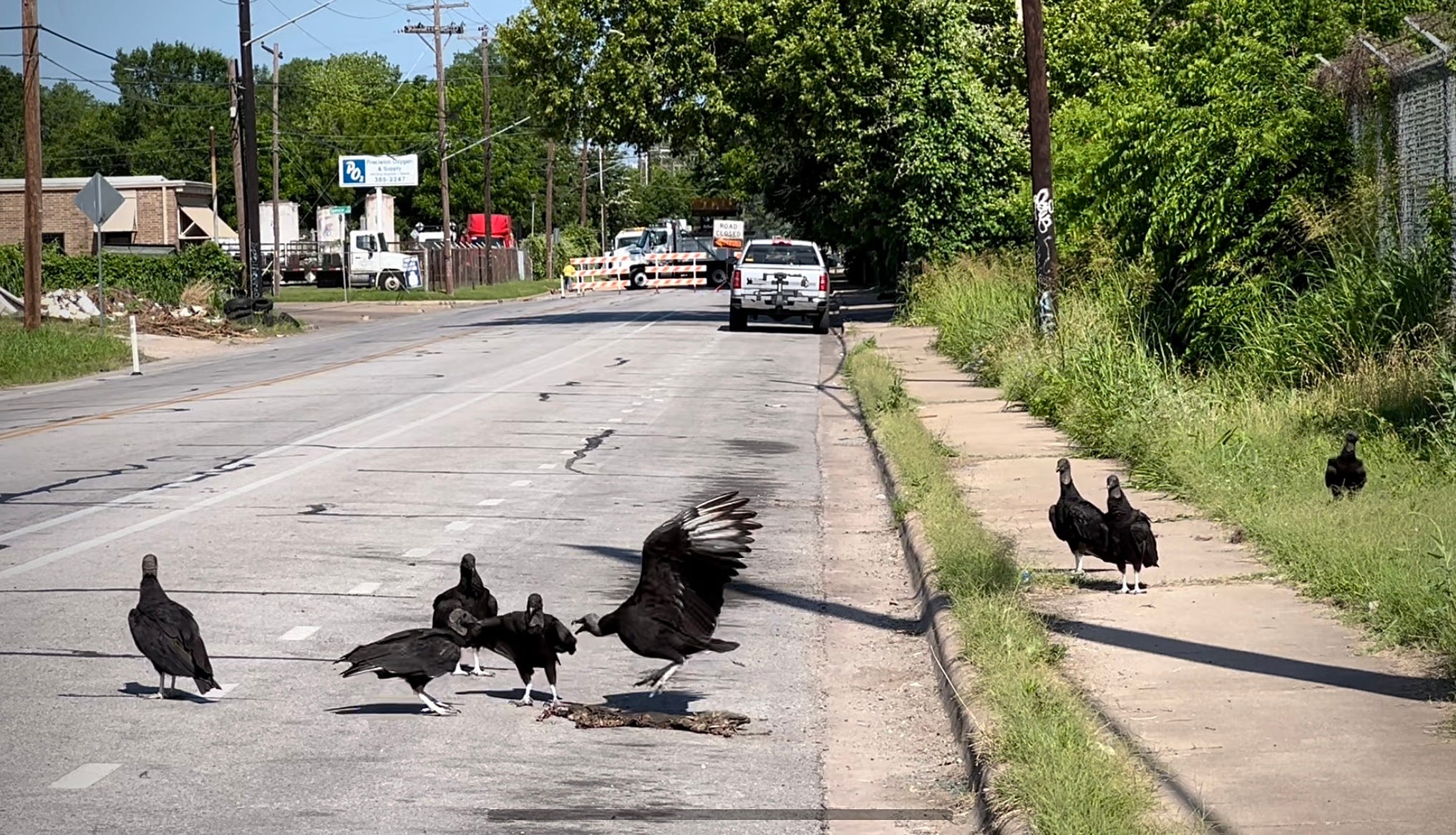 The vultures were so intent on their prize that they didn’t even move until we got close enough to smell them, close enough that you could almost feel the air rush from their lazy, reluctant wing beats. Even the dog didn’t deter them. Maybe because that was what they had claimed. Not just any dog, but a wild one that had emerged from the woods behind the industrial park to hunt the night city, only to get hit by a car. A big fox, flattened like Wile E. Coyote after the Road Runner drops the anvil on him, but still recognizable from the trademark banding of its tail, even if it had been sullied by the filth of the street.