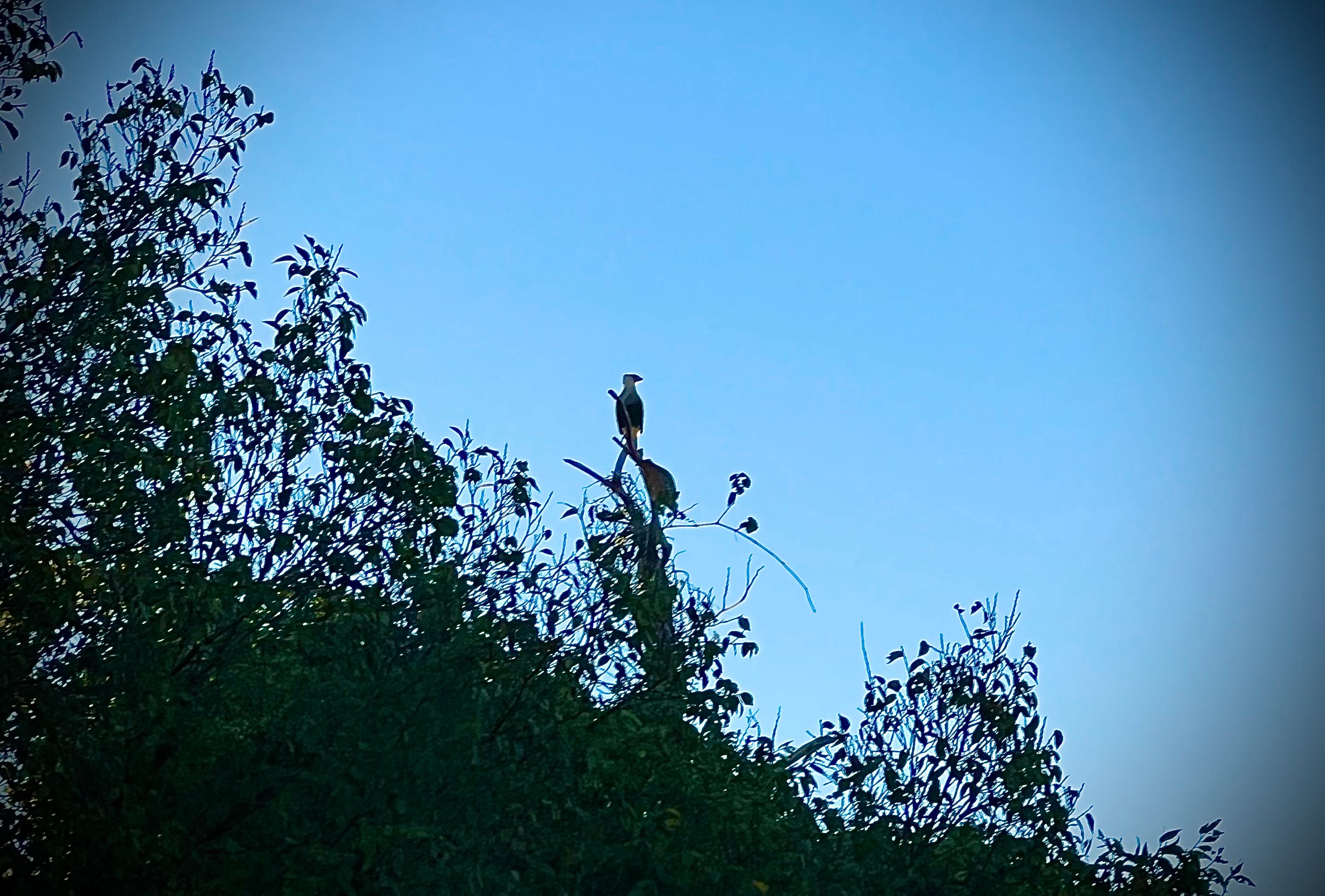 When we stepped back out of the woods onto the rocky bank of the river, we heard raptor cry. And when we looked up in the trees there were three of them cavorting—two caracara and a hawk, it appeared, based on the song, though we couldn’t see the hawk, and even the caracara were intensely backlit by the new day’s rising sun. But you could hear the closest of the caracara, and even see it vocalize with that crazy crested head, emitting an ack ack ack that seemed simultaneously erotic and horrific. The satisfied sound of ancient generalists at rest.