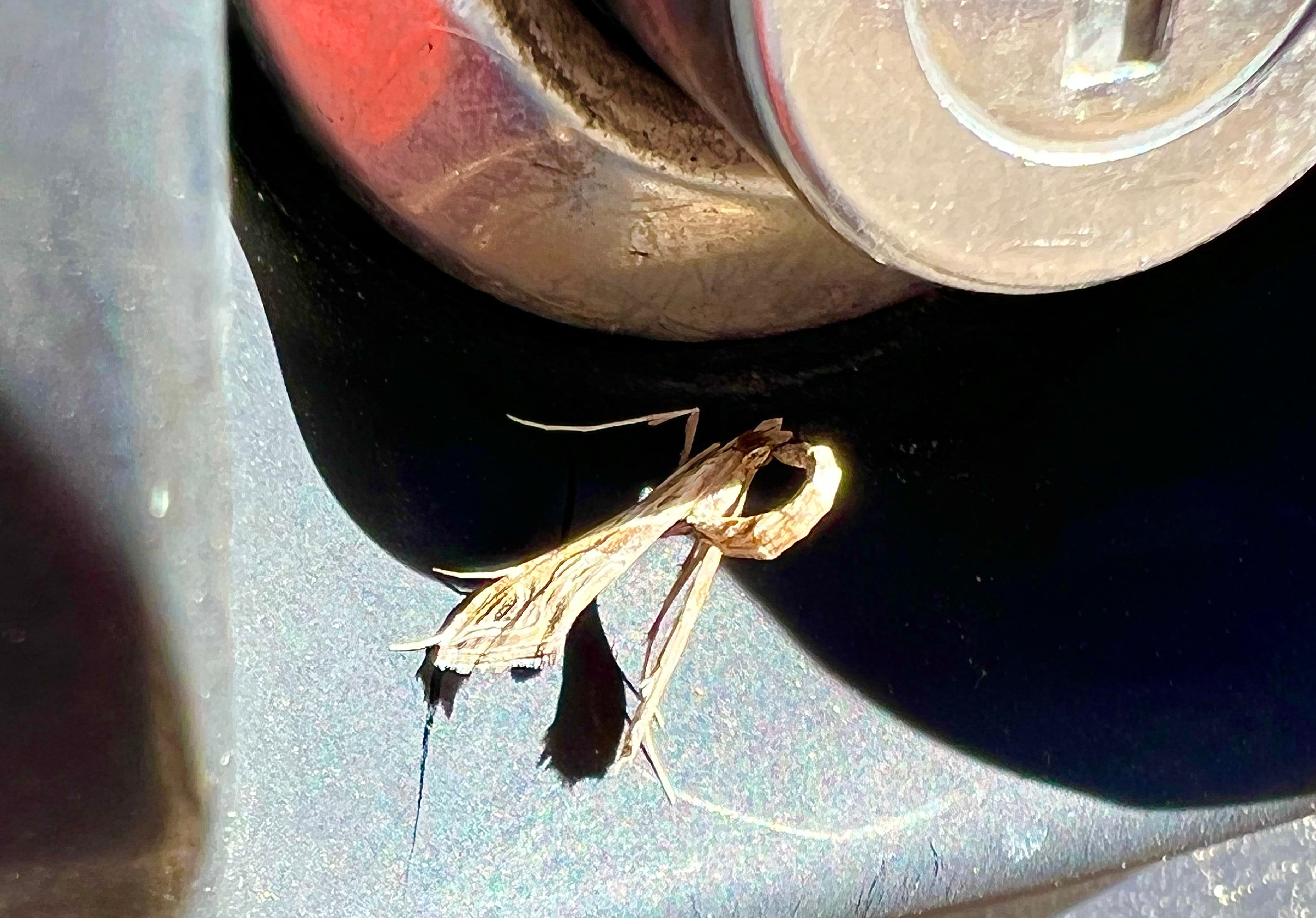 When I went to my old truck to prepare for our excursion, I found this strange creature lurking under the latch of the rear lid. Winged without wings, adorned with little spikes, abdomen curled up like a stinger. A plume moth, I think, one of the Pterophoridae who somehow fly on on bristled spars, and always remind me of the trippy album cover dream machines of the 70s illustrator Roger Dean. Though the soundtrack of a plume moth coming in to feed is probably not Prog.