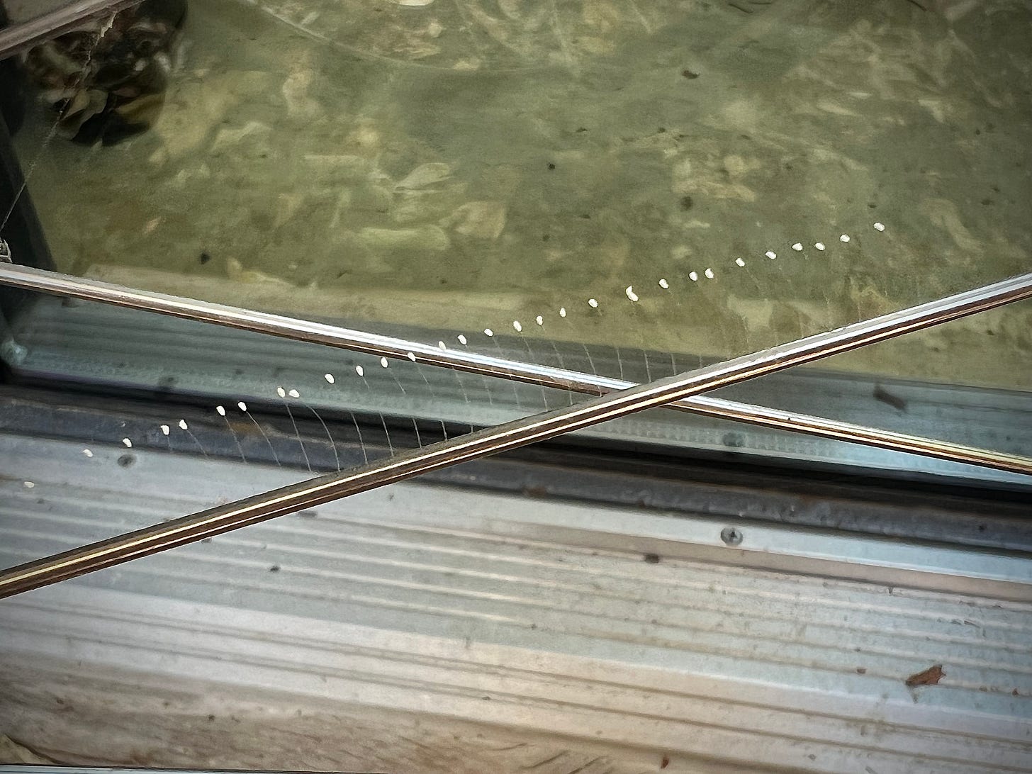 A little later, when I went to get the bike with the child seat on it ready for our ride, I found 39 eggs on long thin strands grown out from one of the spokes. The second such eggs, or what seemed like they must be some kind of insect egg, that I had seen this season planted on the steel surfaces around our house. The prior clutch was on the frame of our bedroom door, which opens onto the outdoor patio, and was smaller. I had been meaning to try to find out what they were, and after showing them to my fascinated daughter, I learned they must be the eggs of lacewings, a graceful little green flyer whose monster tank larvae can each eat as many as 60 aphids in an hour. I welcome their imminent counter-infestation, and only wish they could have come earlier.