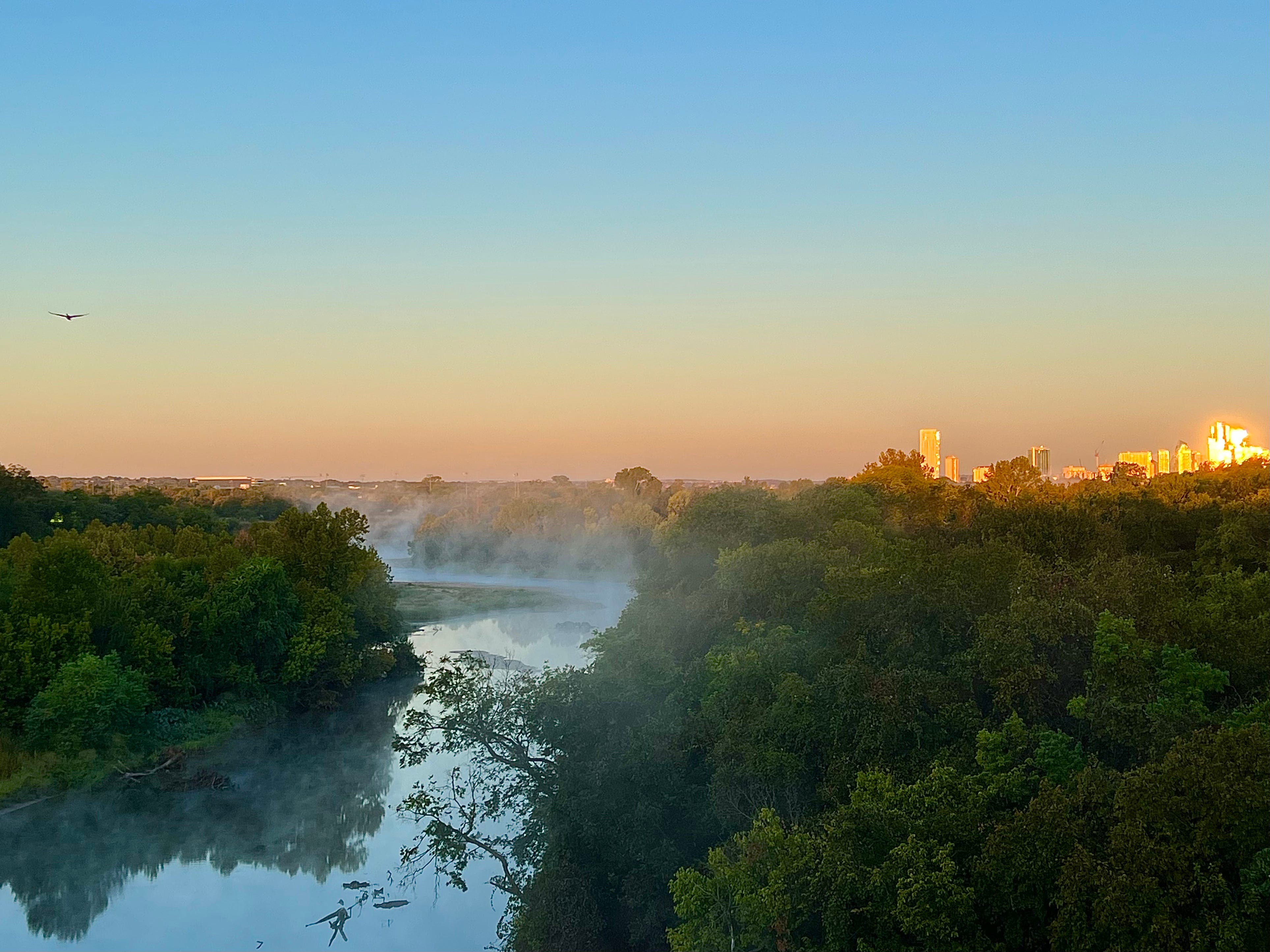 What passes for autumn in these parts has begun to settle in, even as the leaves are still on most of the trees, and only a few species have even started to bleed off the green. In the mornings the river wraps itself in a romantic fog that hides the trash and the reminders above the treeline that, as green and wild as it is in that pocket, you are in one of the fastest-growing cities in America, and the city wants to eat every pocket of wildness that has somehow been allowed to persist in its margins.