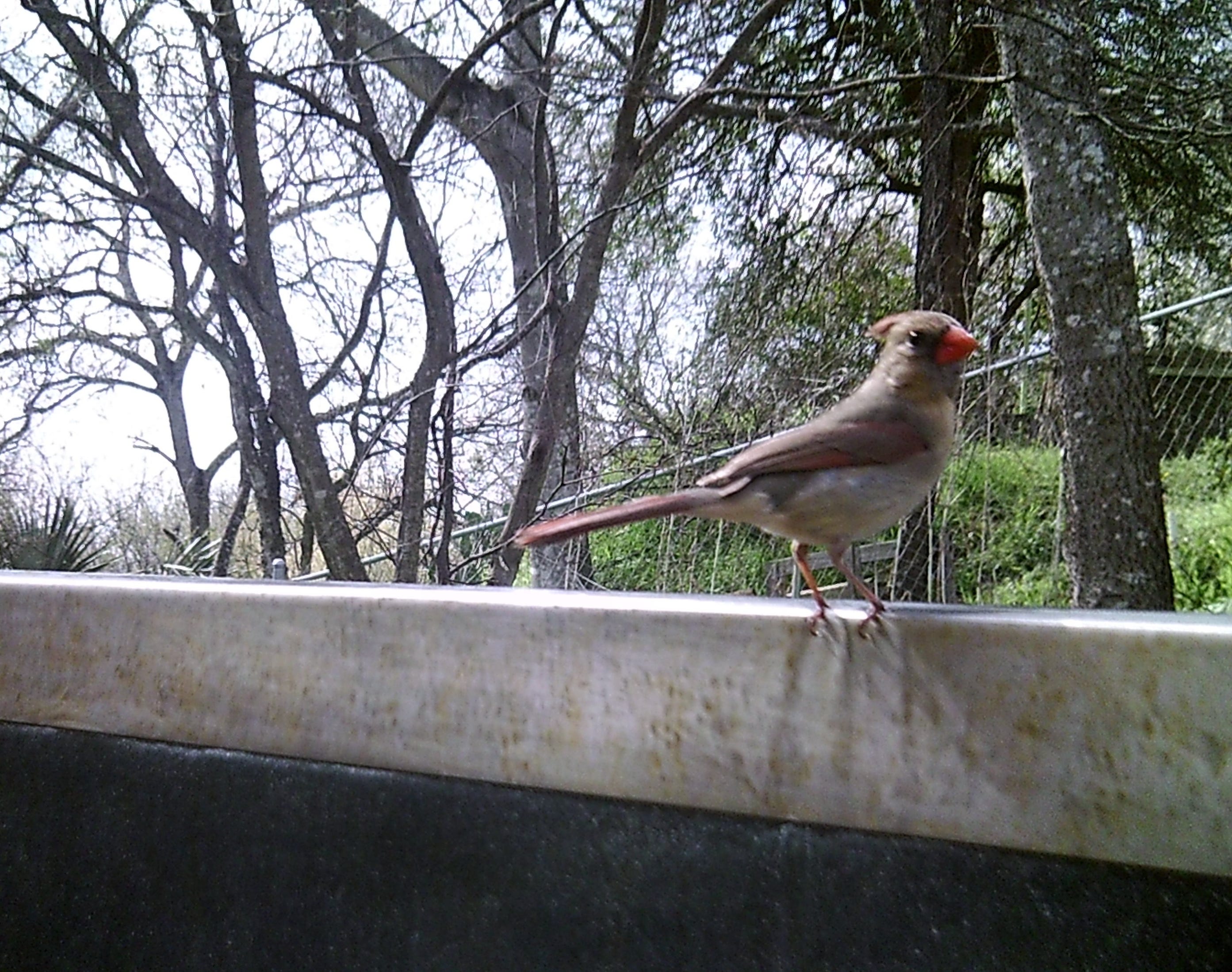 Cardinals are not one of the birds you get excited about. They are a common songbird that has always been nearby my entire life, among the easiest to identify for the same reason the Texans often just call them “redbirds.” They are especially common here in our yard in springtime. In the morning you hear their chorus, and all day long you see them getting busy. I just read that they are one of the only North American songbirds in which the female sings as well as the male, perhaps telling the male when it’s time to bring the food. No wonder they fit in so well in our space.