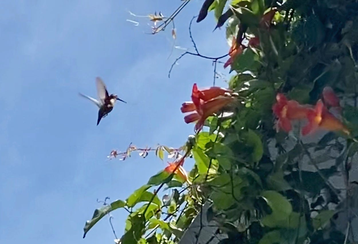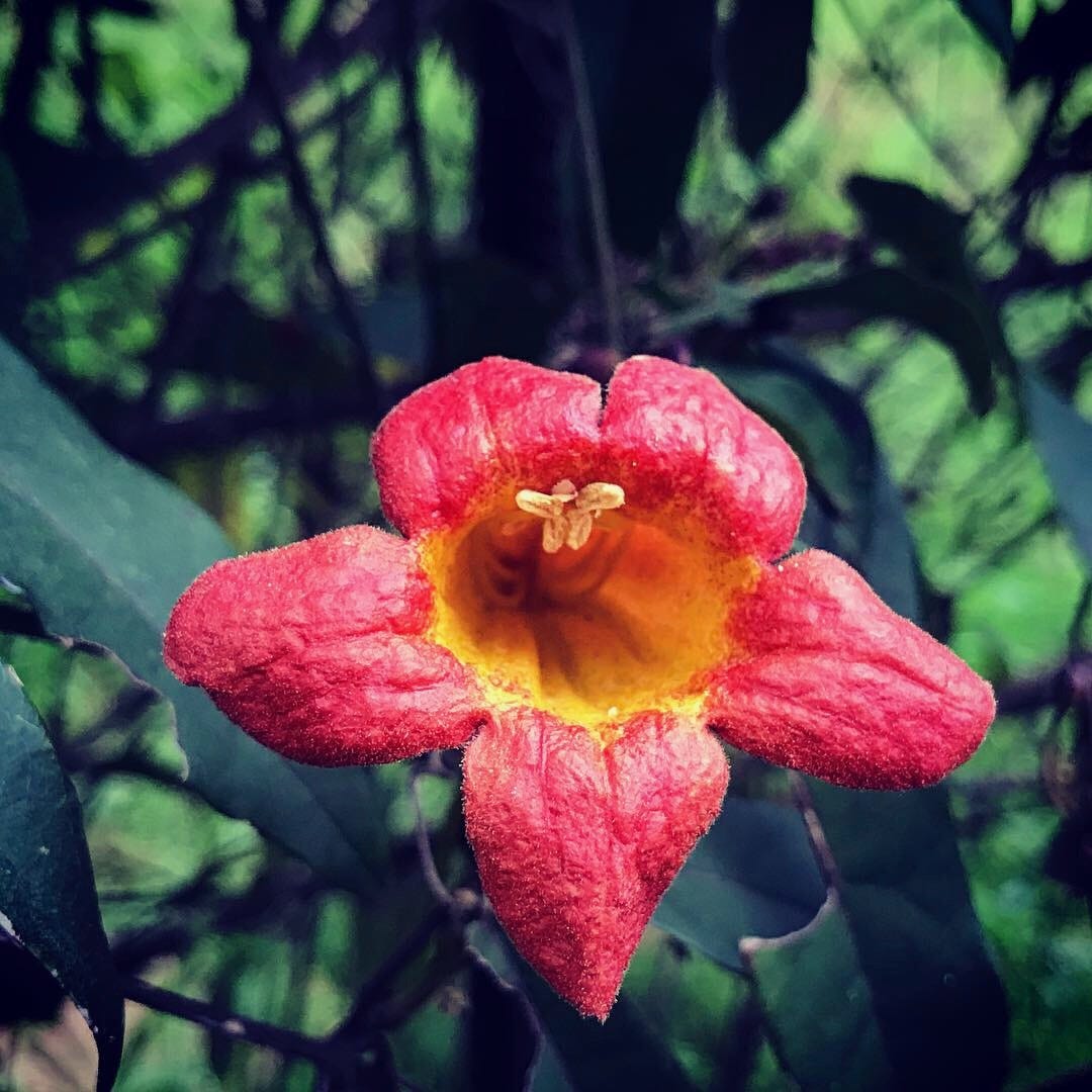 The cross vine is a native plant, with a bold orange-red trumpet flower. When the hummingbirds show up, as they have in full force this week, they show you how perfectly those flowers have adapted to those birds. They fit together like plug and receptor. The vines bloom in continuous cycles with the periodic bursts of rain we get here, exploding with color when the sun comes out after the storm. They especially love the spring and fall.