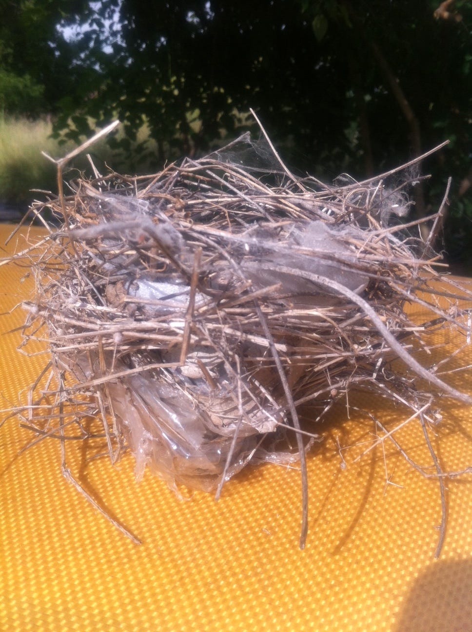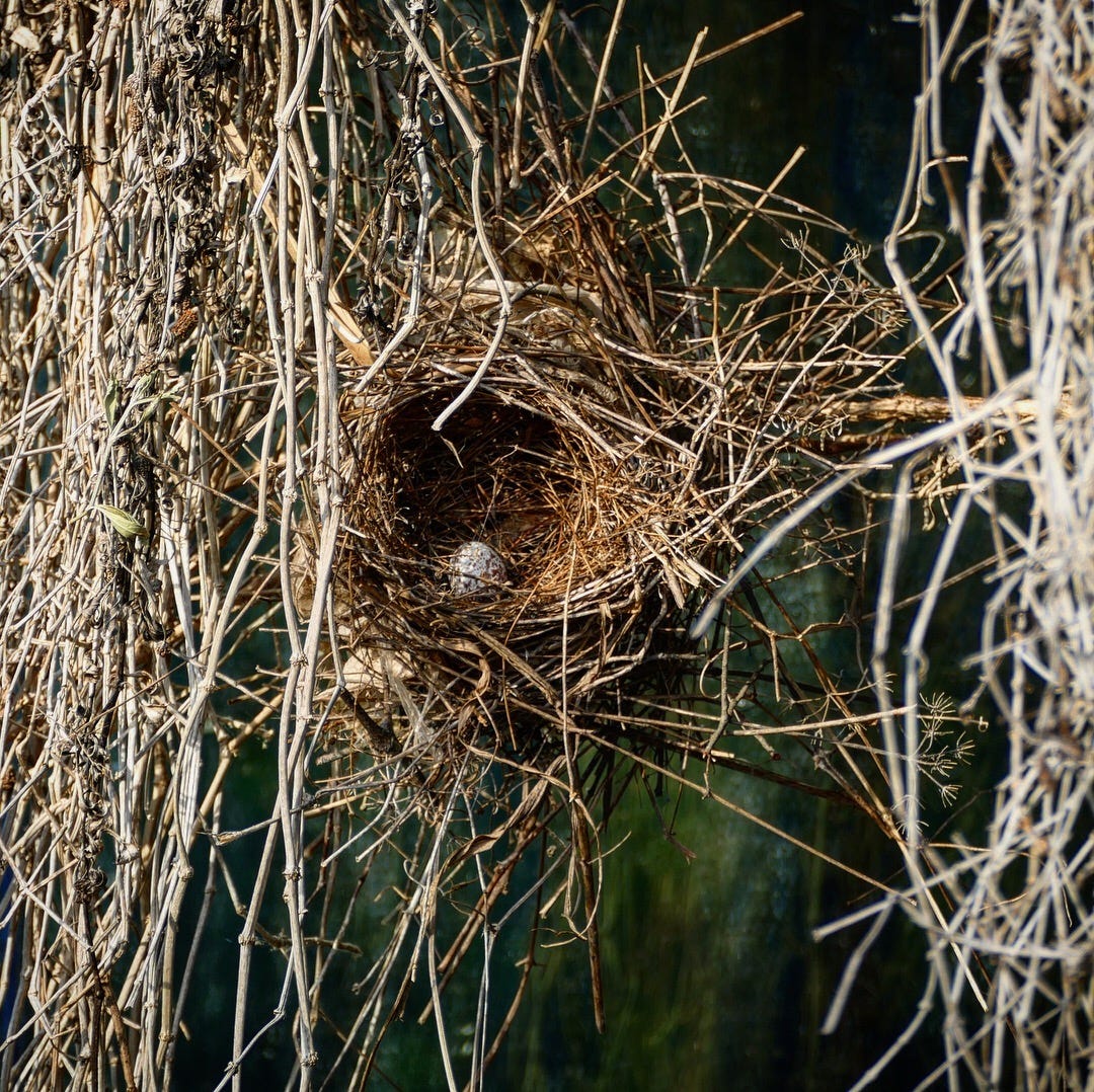 It is only more recently that I have come to appreciate what exceptional Anthropocene adapters the cardinals are. I noticed the nests before I understood who made them. The first one I found was in the branches of one of the bois d’arc trees that grows along our front path. A beautifully shaped little shelter of twigs and dried grass, the perfect size to hold in the palm of your hand. But then I noticed the plastic—fragments of some transparent industrial material used to better insulate the nest.