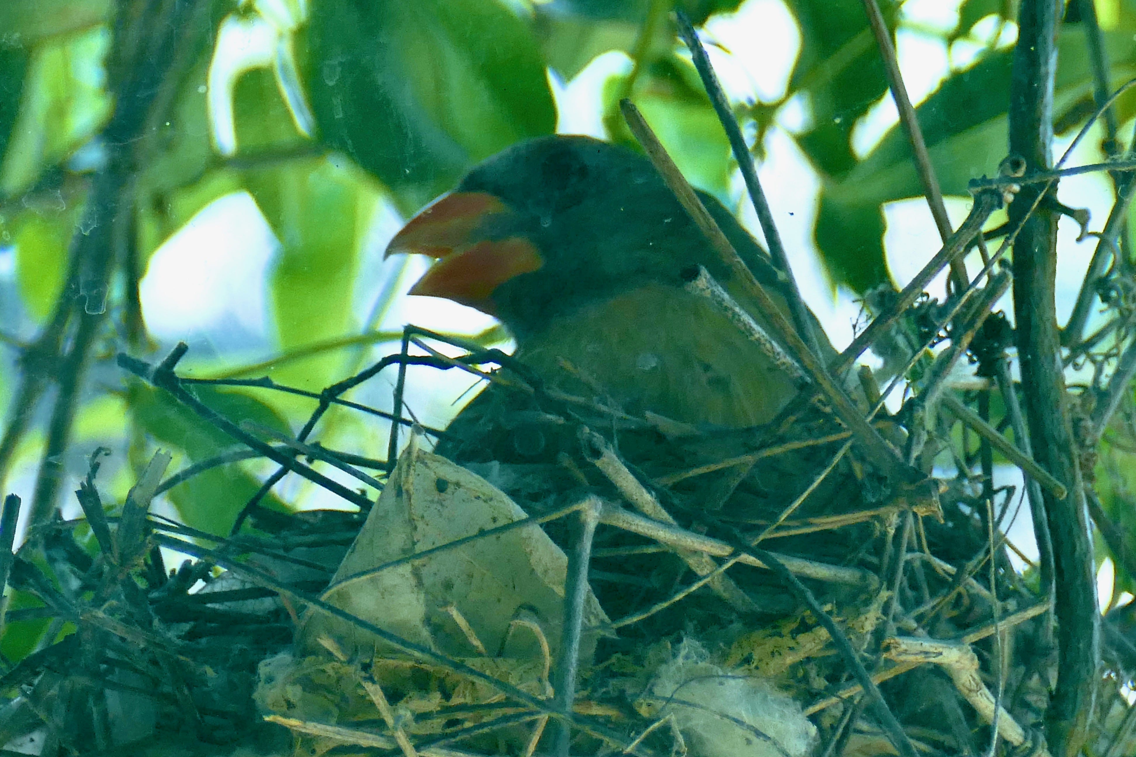 The stems of the cross vine grow thick with time. Not mustang vine thick, but close—thick enough to develop a skin more like bark, and the structural rigidity that comes with that. The glass that frames one side of our living room is fifteen to twenty-plus feet high, and the vines now hang down in a thick lattice half that height, at least in the areas where there is full sun for long parts of the day. There are other native vines mixed in there, like Virginia creeper, which help build all the interconnections that create a naturally occurring structural integrity. But they are still just hanging in the air. When the wind comes, you hear them flapping against the windows. You wouldn’t think it’s the ideal foundation on which to build a shelter. But that’s exactly what the cardinals do.