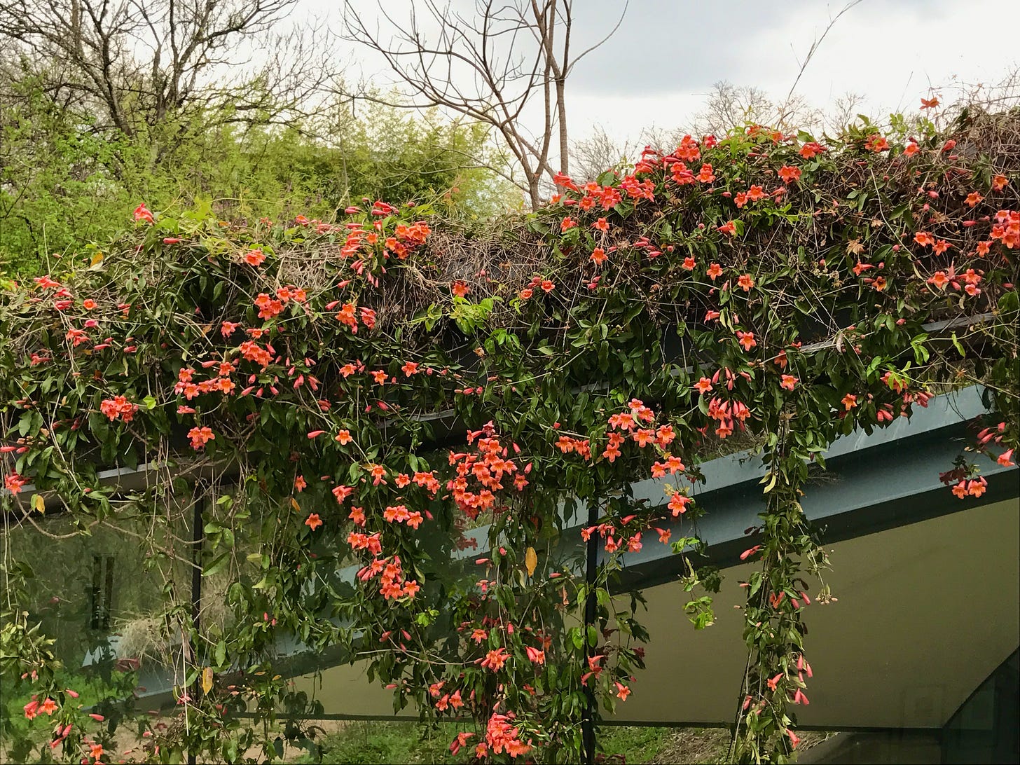When we first installed our green roof, our friends from the Wildflower Center planted some cross vine along the edges that frame the little canyon that divides our sleeping area from the living area, a divide that occupies the space formerly taken by the petroleum transmission pipeline that used to to bisect this lot. I wanted the house to achieve a post-apocalyptic aesthetic, a sense of nature taking over the ruins. My wife wanted to cultivate natural Texas beauty. It took a couple of years for the vines to adapt to this weird space, a bed of growing medium surrounded by modernist planes of steel and glass. But when they did, they flourished, especially in the spots where the afternoon sun shines.