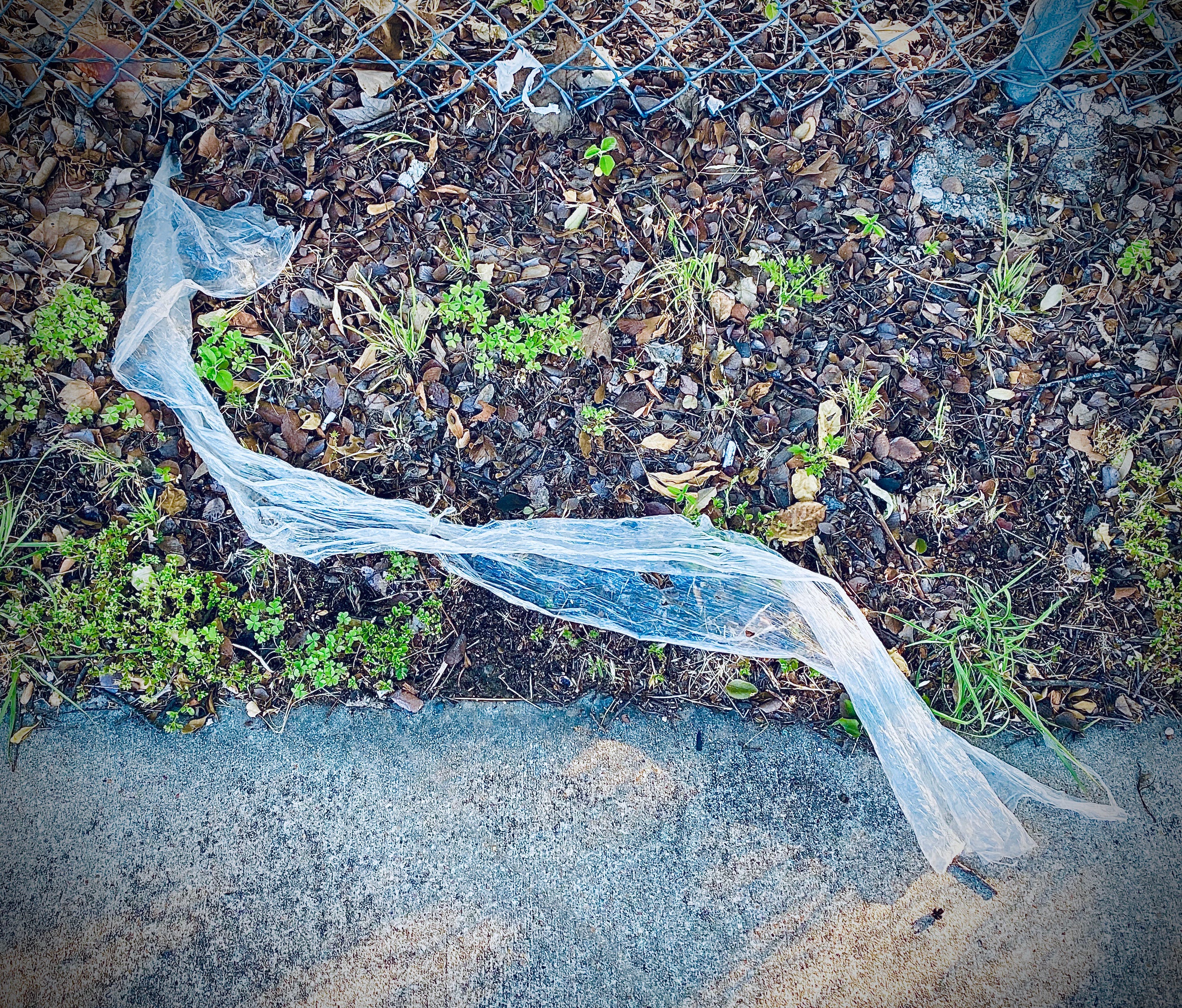 Such materials are in abundant supply around here. Our house occupies a spot where the interstitial wilderness of the urban woods is on one side, and the other side is dominated by light industrial uses—a door factory, a custom lighting studio, the county housing service’s staging facility, a gypsum yard, and a huge dairy plant. Those places generate lots of little pieces of trash, the kinds of things the guys who work there would not think worth capturing. Mostly, they are fragments of the materials we use to pack things for shipping, and also the materials we use to package the things we consume—to-go bags and the cellophane wrappers of cigarettes. When discarded, they collect in the street, up against the fences, and blow into our yard when the winds are right.