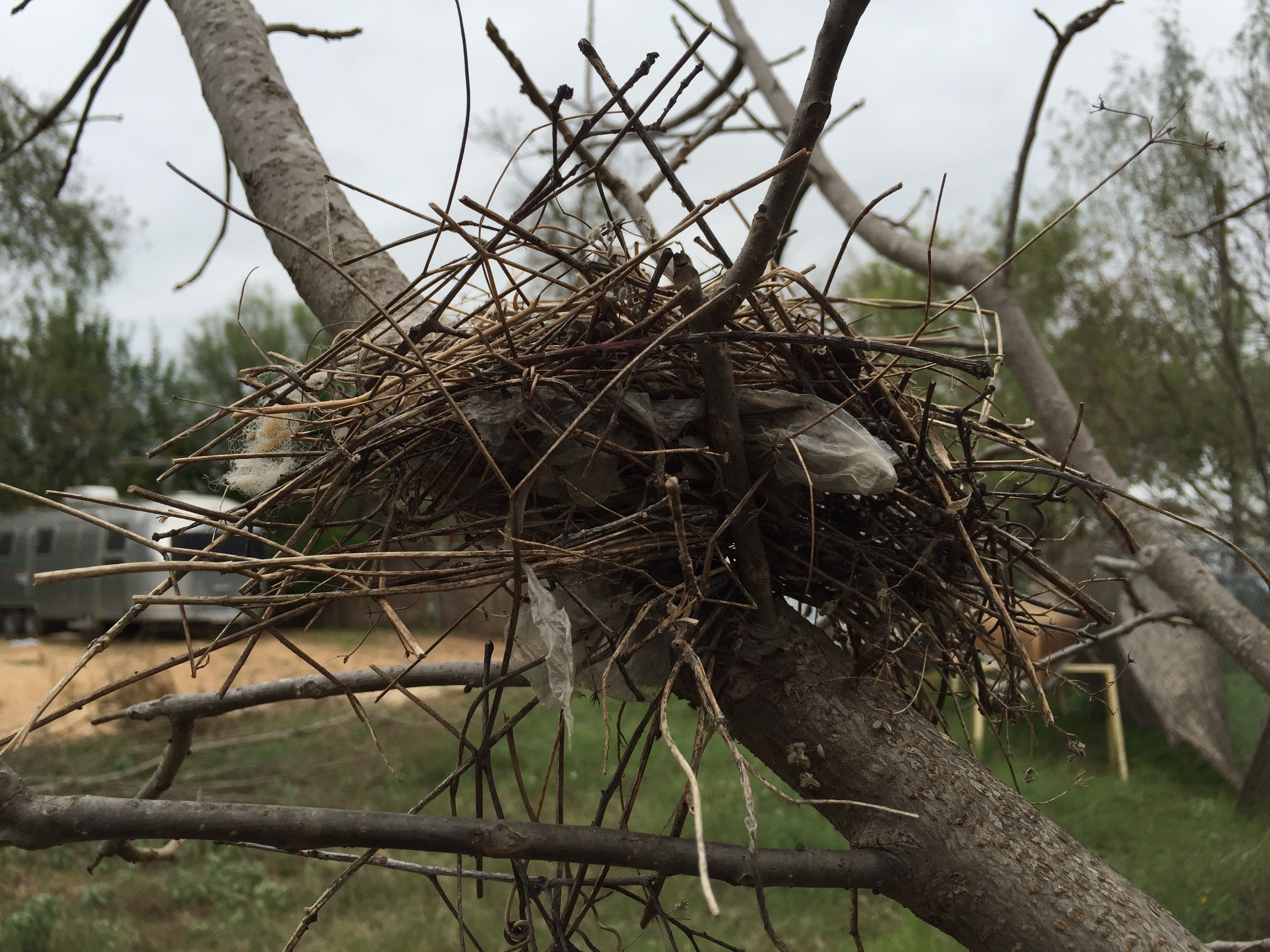 This year as winter ended and spring began, I noticed that the red-shouldered hawks who rule the woods from the high branches of the tall cottonwoods along the river and the tall pecans of the alluvial plains above also use the available industrial materials in their nests.