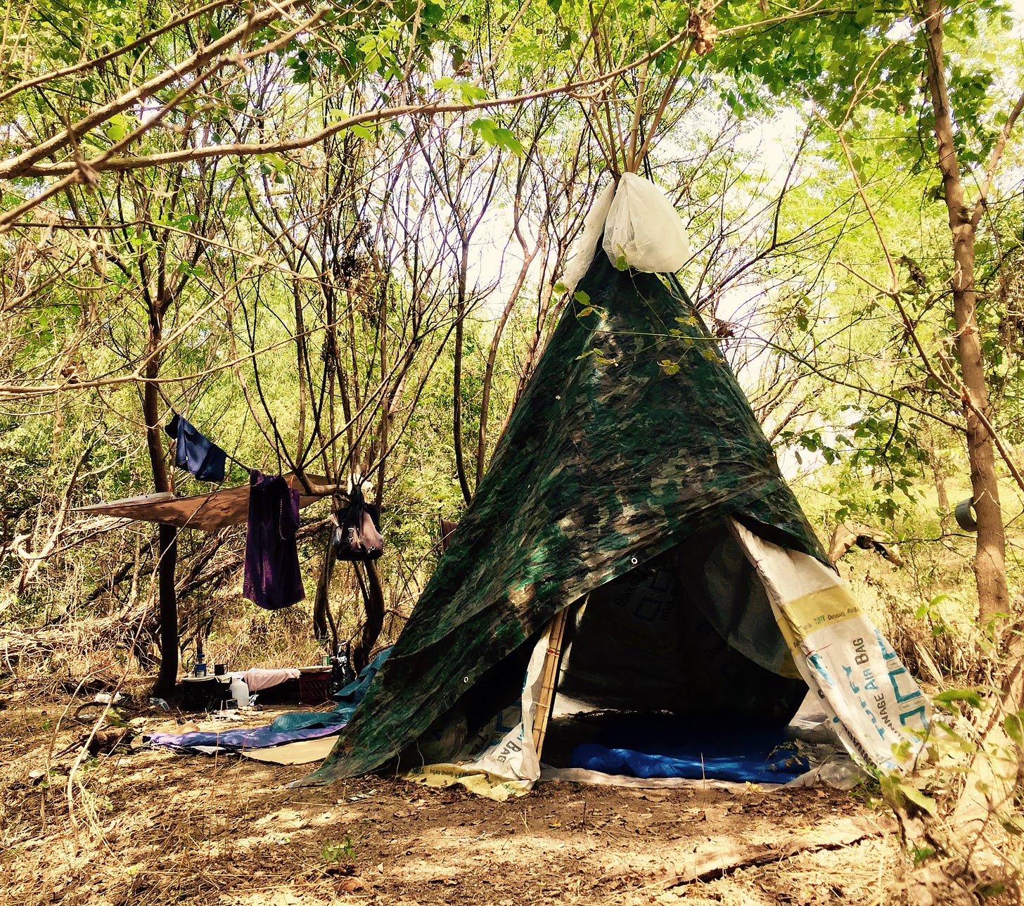 There are humans who employ similar adaptations—the men living outside in these woods, who collect bigger fragments and make their own shelters. A few years ago I came upon a perfectly constructed teepee made from the alien bamboo that grows along the right of way behind the door factory and a big sheet of industrial fabric printed with the logo of some exotic aviation-related brand. In the overgrown traffic island I explored earlier this season, I found two shelters made of similar materials, elaborate lean-tos that had taken on some of the characteristics of houses.