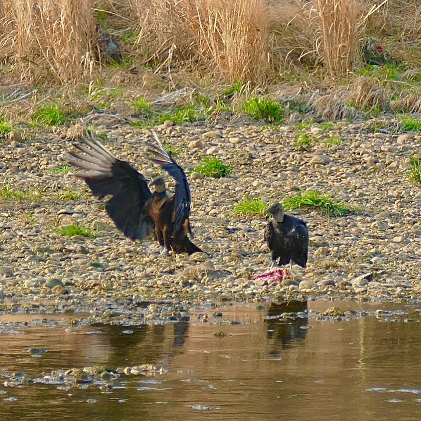 On the shoals under the bridge, a pair of caracara were enjoying some marine carcass. Up above, you could see the secret camp in the bamboo behind the playground, and I wondered if it’s still occupied. After a little while the caracara flew off, each with a big chunk in their talons, and the vultures moved in to enjoy the left-behinds.