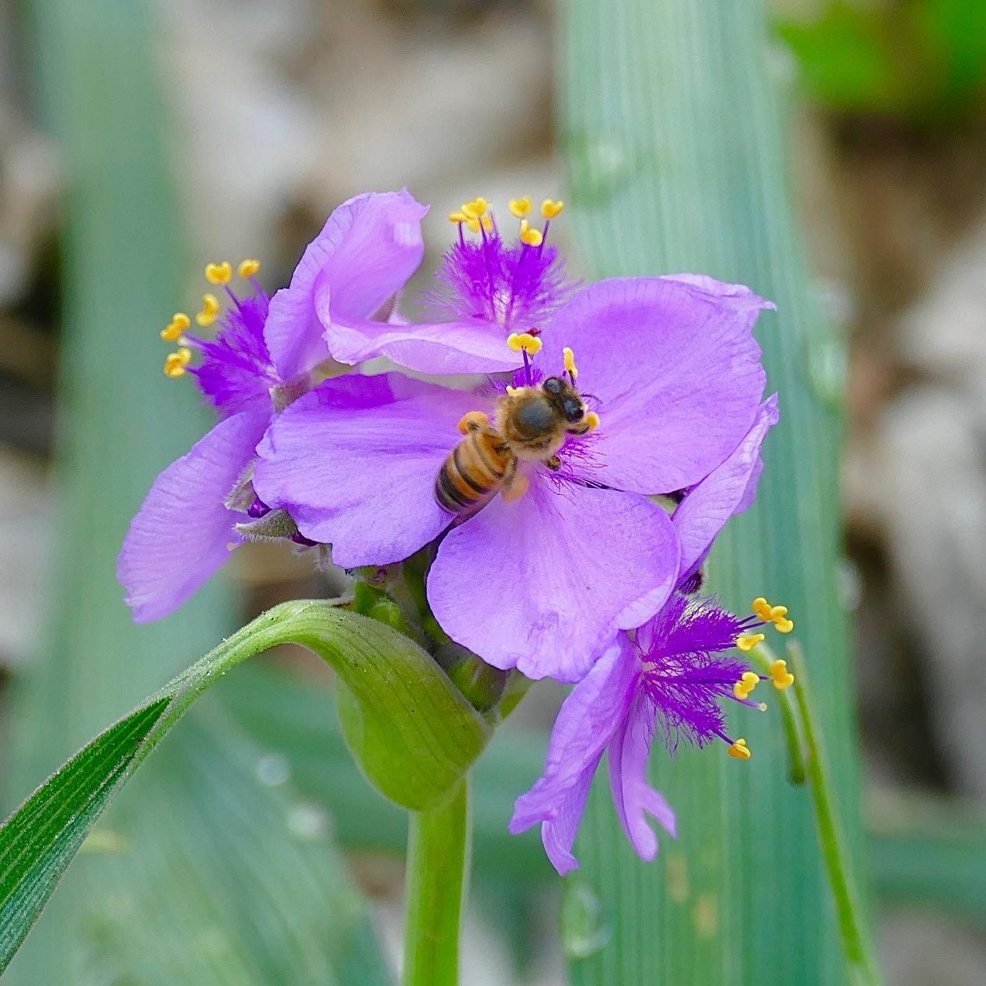 A more photogenic sign of spring can be found in the first blooms of spiderwort along the edge of the bluff. That these plants thrive in the trash-ridden soil of this old dumpsite, under the shade of tall scrubby hackberrys, always amazes me. It’s the first time I’ve really noticed how feathery and fragile (and how intensely purple) their stamens are.