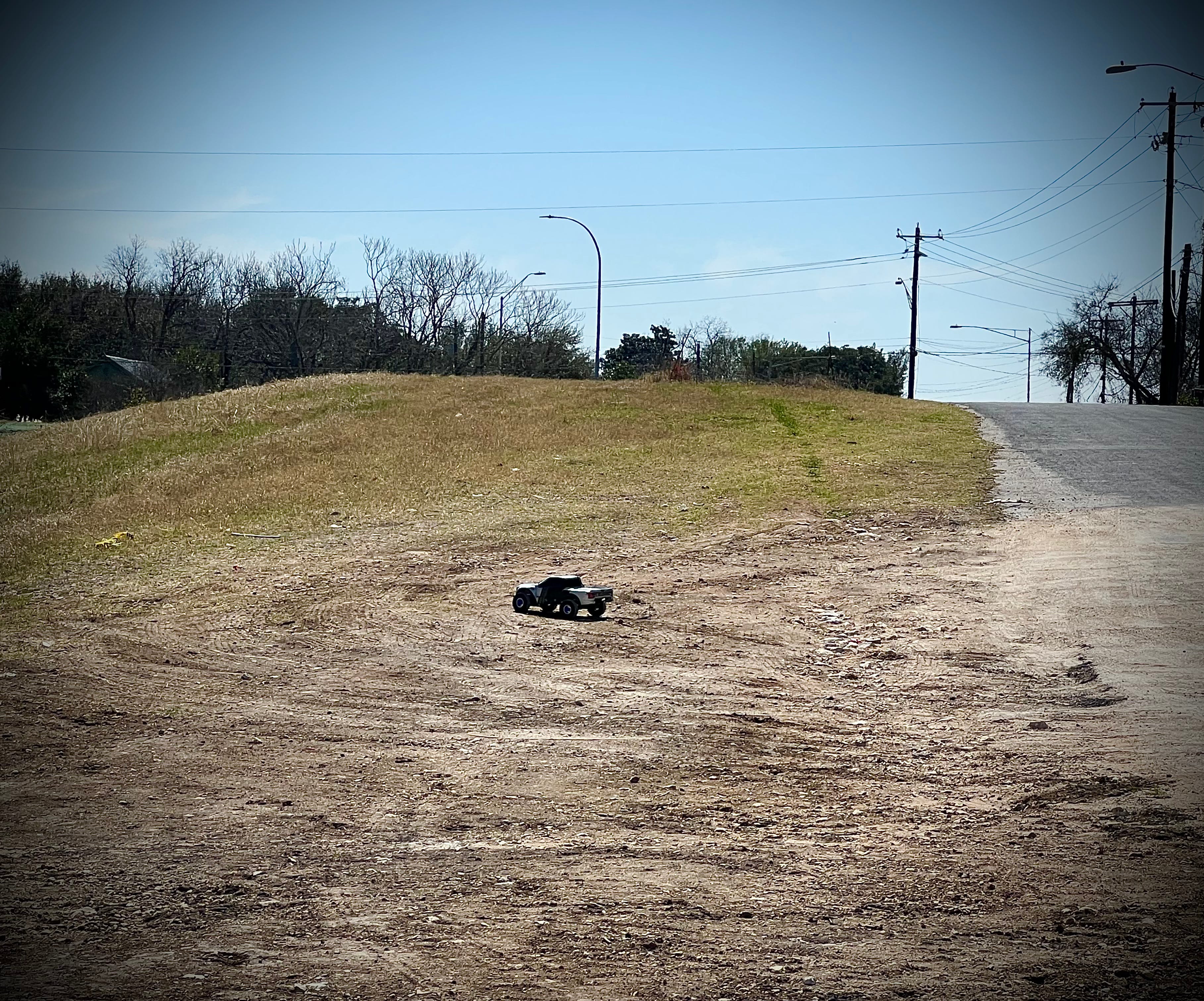 When I crossed the bridge after my encounter with the vultures, I found a dude sitting in his car taking a long lunch with the drivers’ door open and driving his miniature Ford Raptor over the smaller berm by the trailhead, using remote control. TGIF.