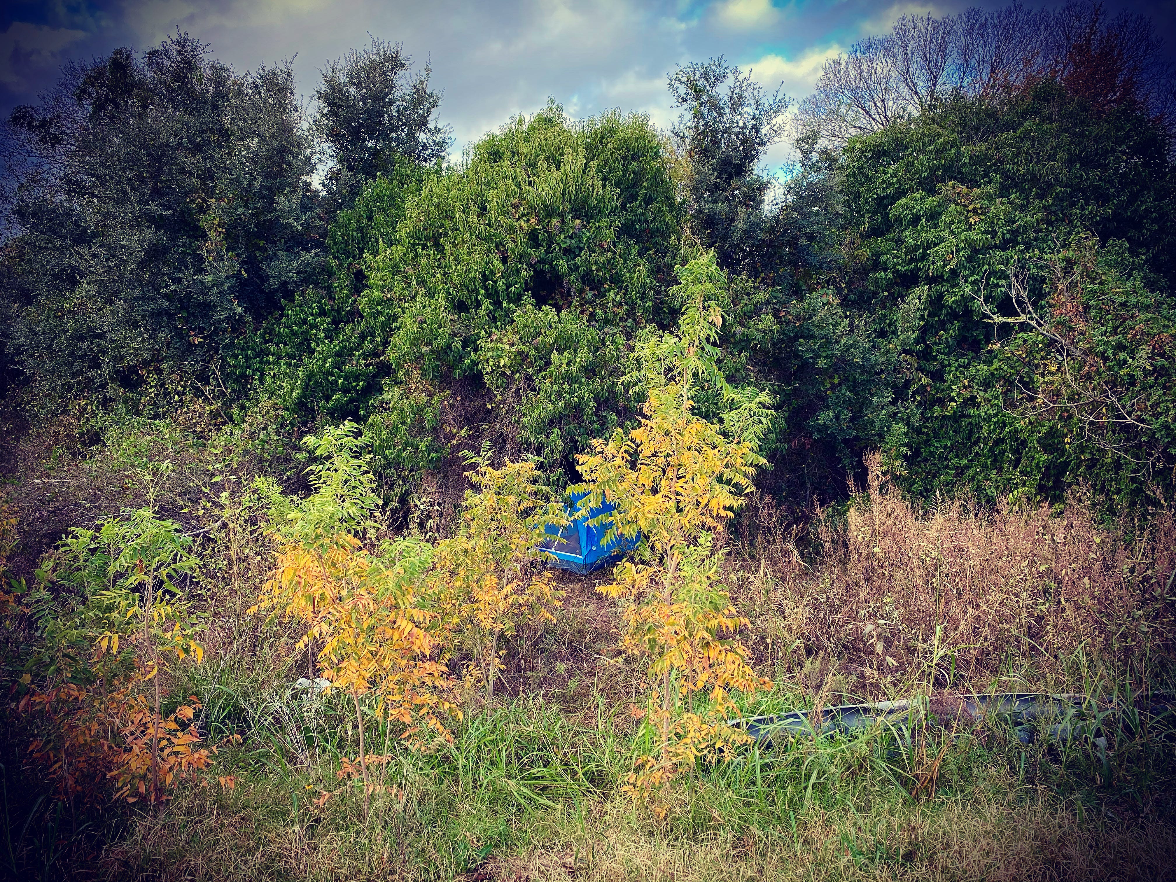 I thought I had fully escaped the city through its concrete heart, when I heard and then saw another man walking through, crossing my path. A generic white guy in shorts and a T-shirt, coming down out of the dark woods behind the Lowe’s. I moved into shadow behind the trees, figuring this was not the ideal place for encounters with strangers, and watched him cross the creek with a much clearer sense of destination than I had, and then listened to the crunch of dry grass and leaf litter as he disappeared into the foliage.