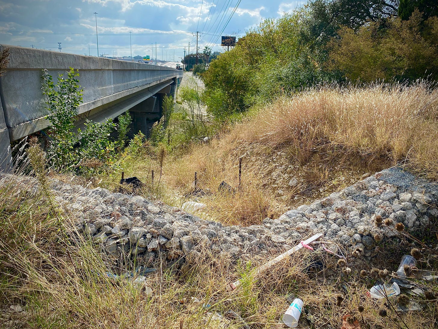 There was no trailhead to get to the creek from the road, not even a desire path. Just a big gabion layered over the lip of the embankment where the roadside ditch finally arrived at the drop into the real channel. The right of way ended there—the only way to cross the bridge on foot would be to run in traffic. So I stepped down toward the shadows, looking for a portal into green.