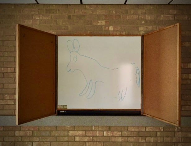In one conference room, I opened the wall cabinet to find a whiteboard on which someone had drawn a primitive figure of their antlered prey in dry-erase marker.