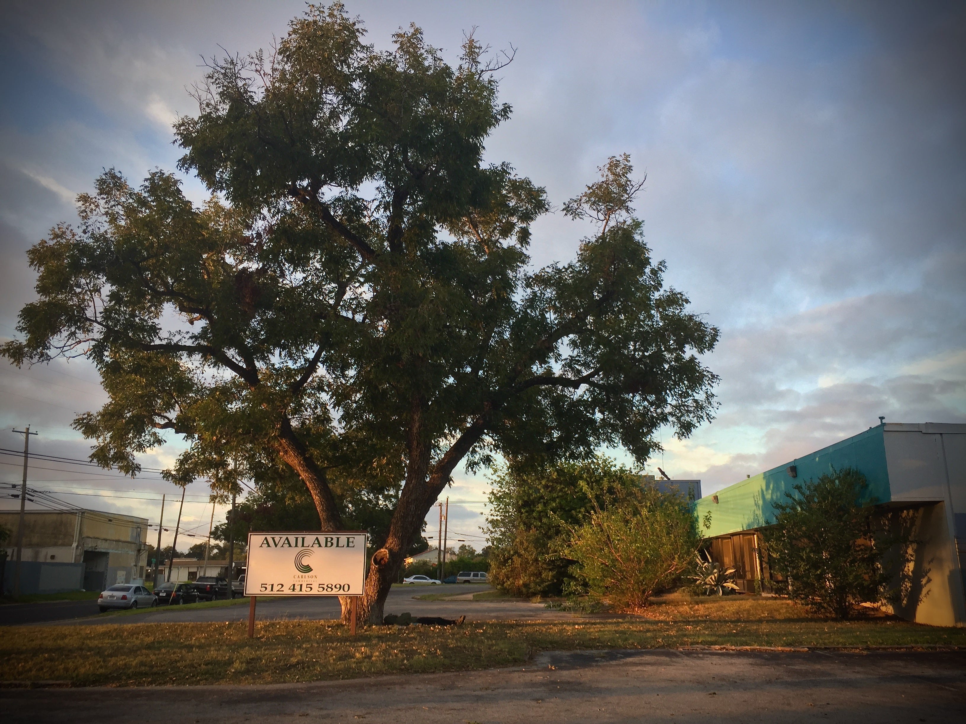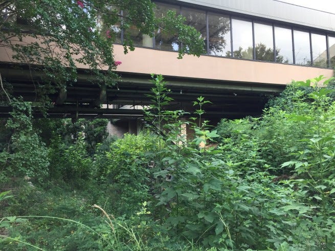 It’s probably eccentric to enjoy living down the street from an abandoned factory, and to appreciate the inability of its owners to redirect its entropic trajectory. I’m told that before we got here, back when W. was POTUS, the Secret Service used it as a staging area for their militarized black flannel Chevys, and I once found a Camp David cufflink along the curb. It was a popular outlaw skate park until the loading dock finally collapsed, and had a brief run as the location of the cantina in a direct-to-video narcothriller. One beautiful October day five years ago I was admiring one of the big trees in the lawn when I noticed a guy taking a nap in its shade, right next to the for sale sign that has since rotted away and fallen from its posts.