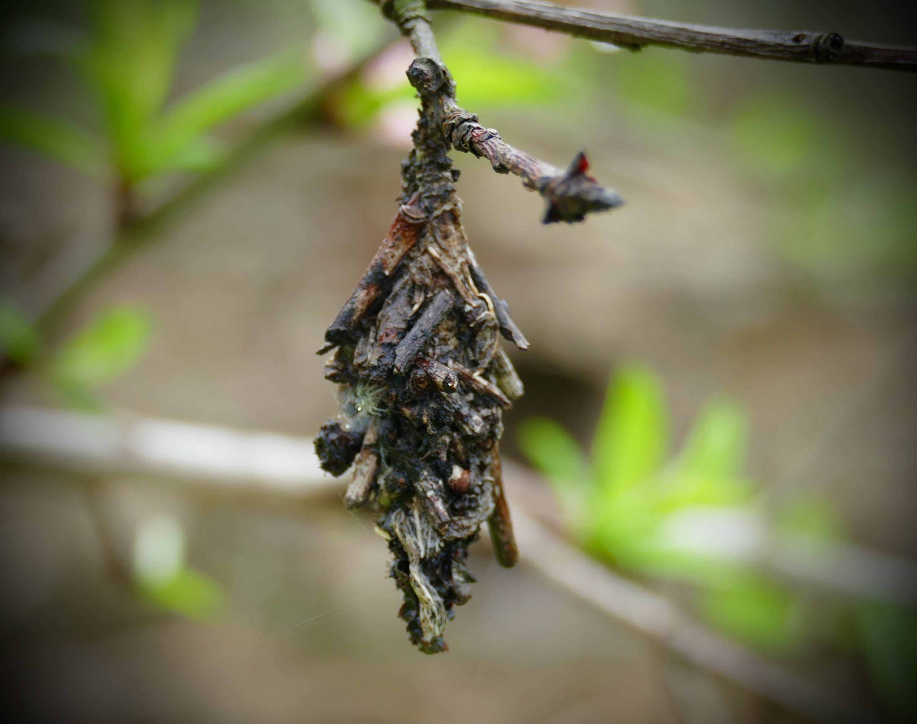 Right below that blossom hung the deadwood cocoon of a bagworm, made from tiny sticks a lot like the little shrine I found outside the light factory. As I wondered whether the creature inside that strange and wondrous little shelter survived the freeze, I thought about our own coming re-emergence, and whether we might figure out ways to apply the lessons of life under quarantine to liberate ourselves from the clock just a little bit, even as it demands our ritual submission to its rule.