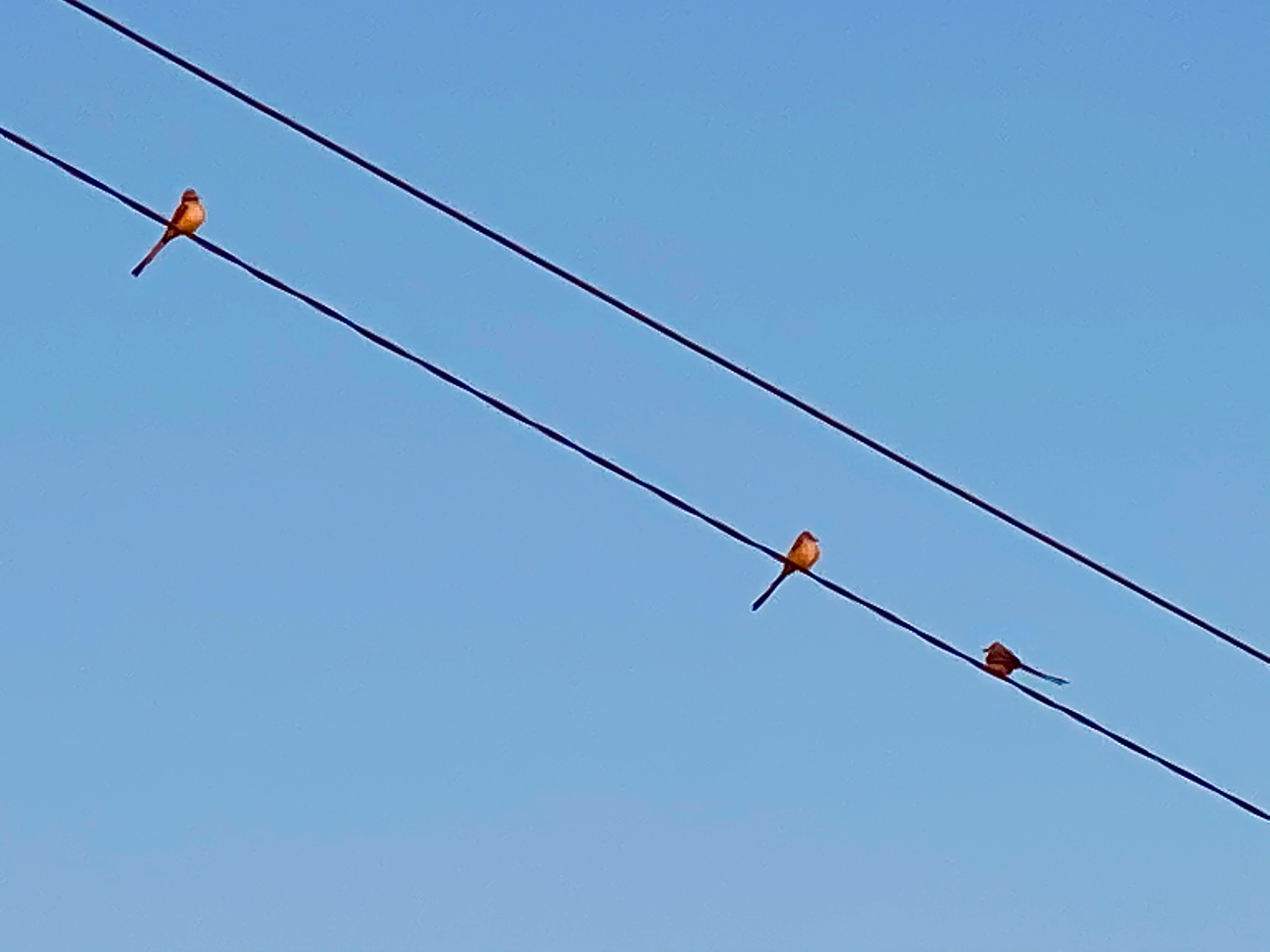 After I dropped my package inside, I stepped out onto the mostly empty parking lot at the very edge of the developed part of the metroplex, an area that until recently was mostly old ranches and back streets of little hand-built houses that look like the set of the Robert Rodriguez remake of Mad Max, and is now being scraped to make room for your stuff. The last light of the day was shining, and I saw a group of scissor-tailed flycatchers there over the brush just past the parking lot, a bird you can never miss in flight once you have seen it, with its namesake tails like Johnny Depp ailerons evolved to chase flying bugs through the air.