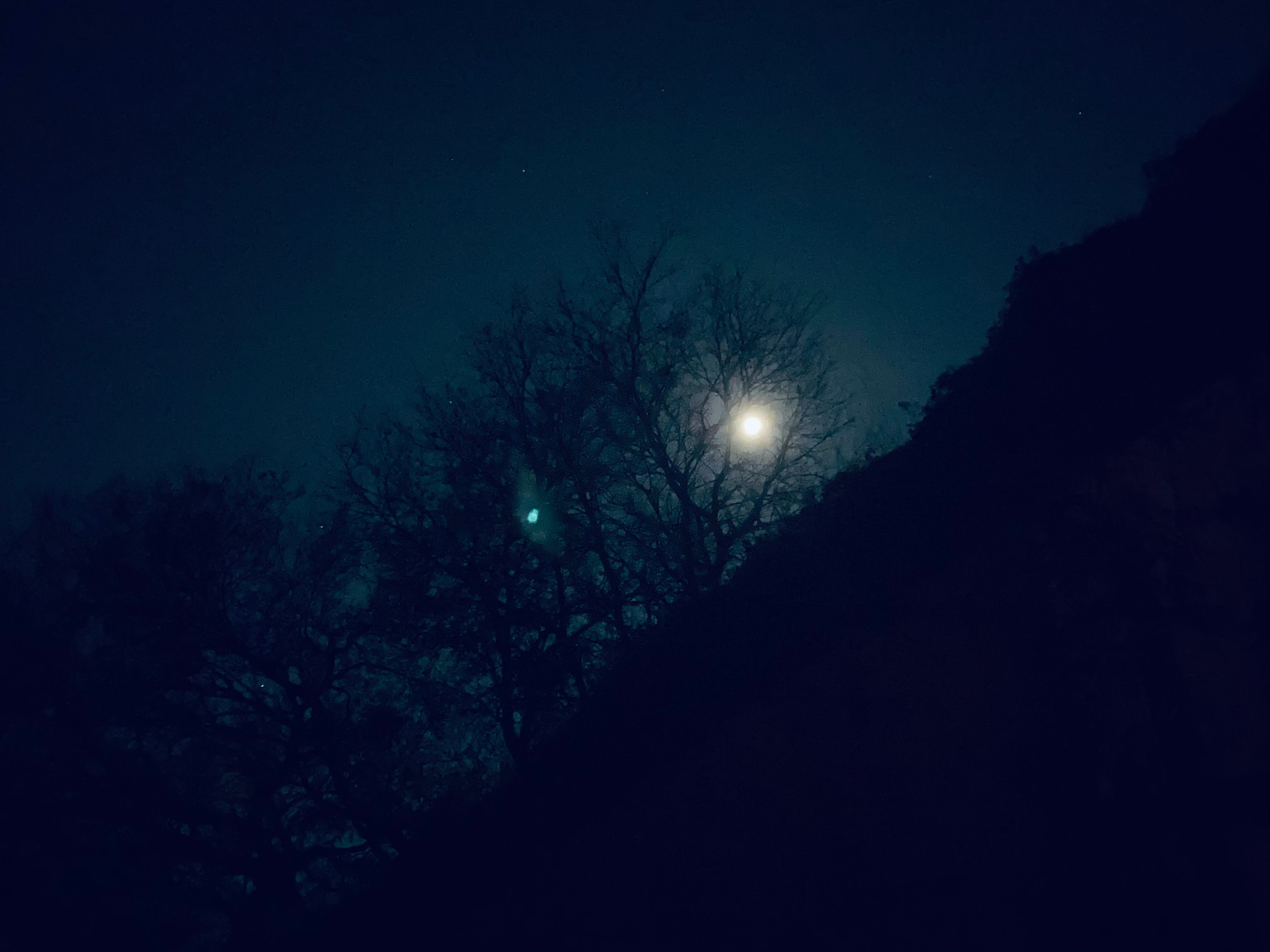 Monday morning I woke around 3 a.m. to the first full moon of winter shining down on me as it worked its way down toward dawn. Our little Teletubby bunker functions a bit like a sundial, with peaked windows that pull the arc of the sky and all of its activity into our rooms, which is cool in the way it connects you to the outside, even when it makes you feel like the Moonwatcher from 2001, the anxious hominid who stays up all night in the cave watching for predators and signals from alien intelligences.