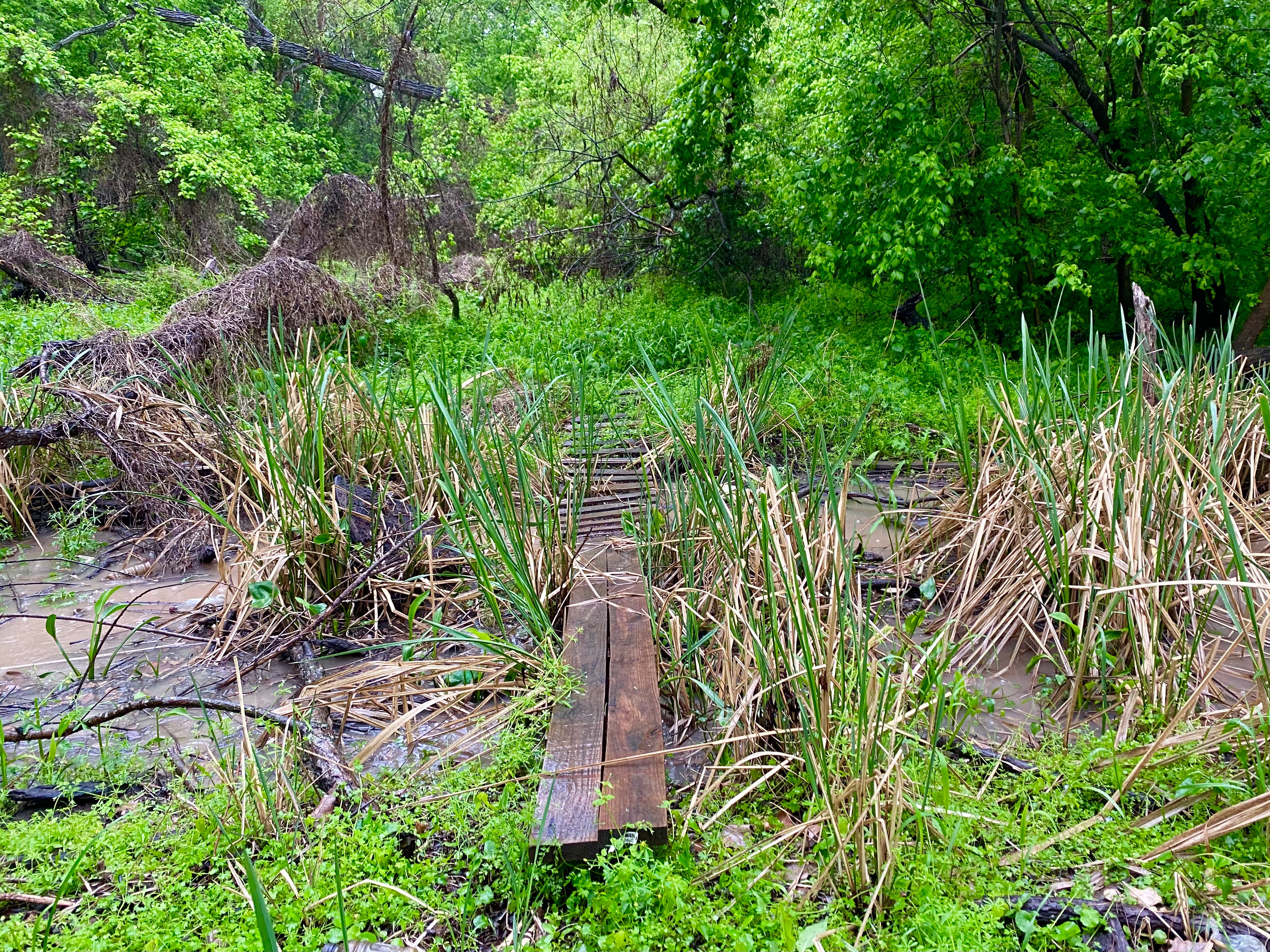 Down in the creek that feeds the swamp with water flowing from the drainage ditch, someone had made a new bridge from flotsam wood of the floodplain. A bridge to nowhere, I thought, way off trail, connecting two banks that would soon be impassable. A winter traveler who made camp back in there, perhaps, or some lair of the Texas Druid King.