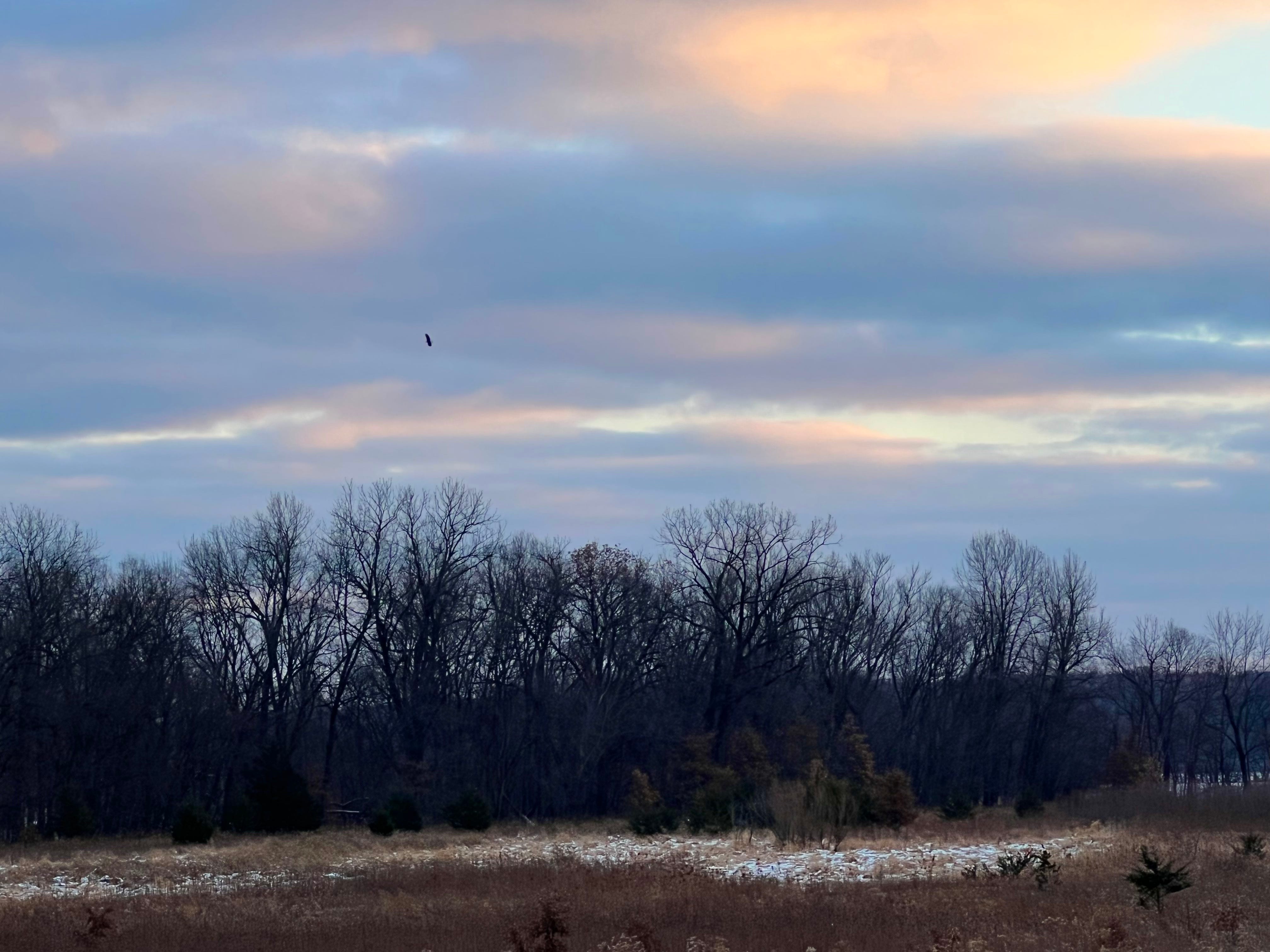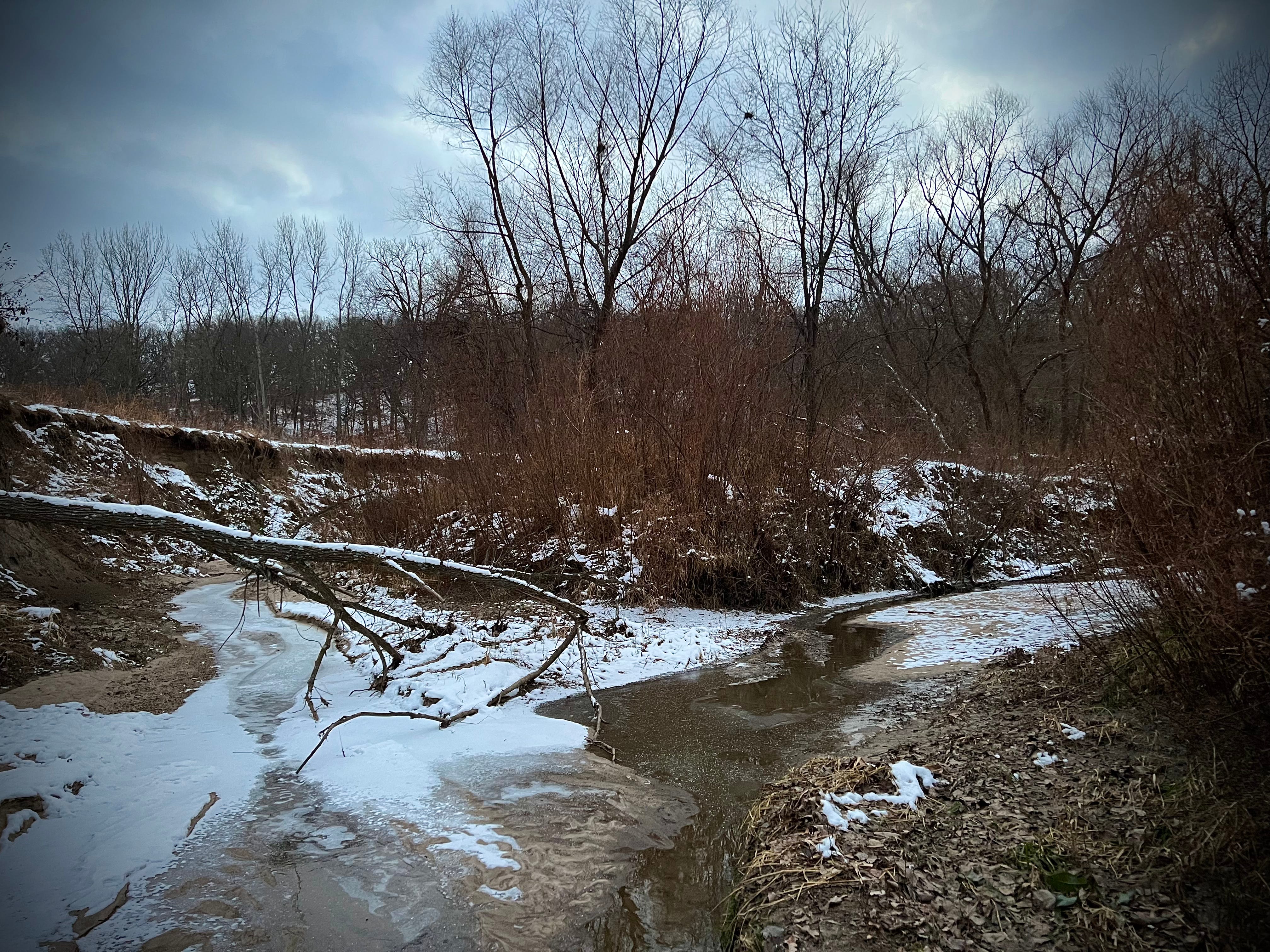 I conducted an experiment in creek confoundment the weekend before Thanksgiving. Not in an urban creek, but a rural one, as I was in Southern Iowa retrieving my recently widowed mother to come spend the holidays with us. I decided to do it at dusk, to amp up the effect, on a day when the first words that came through my mom’s television in the morning were the regional weatherman saying “it feels like two below.” A feeling I confirmed when I went out for windy trail runs along the edge of the property two days straight. But the early snow was still shallow and dry, and when I got to the western ridgeline, I saw eagles.