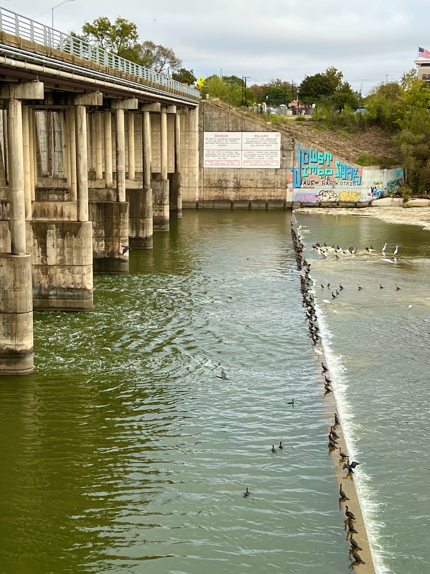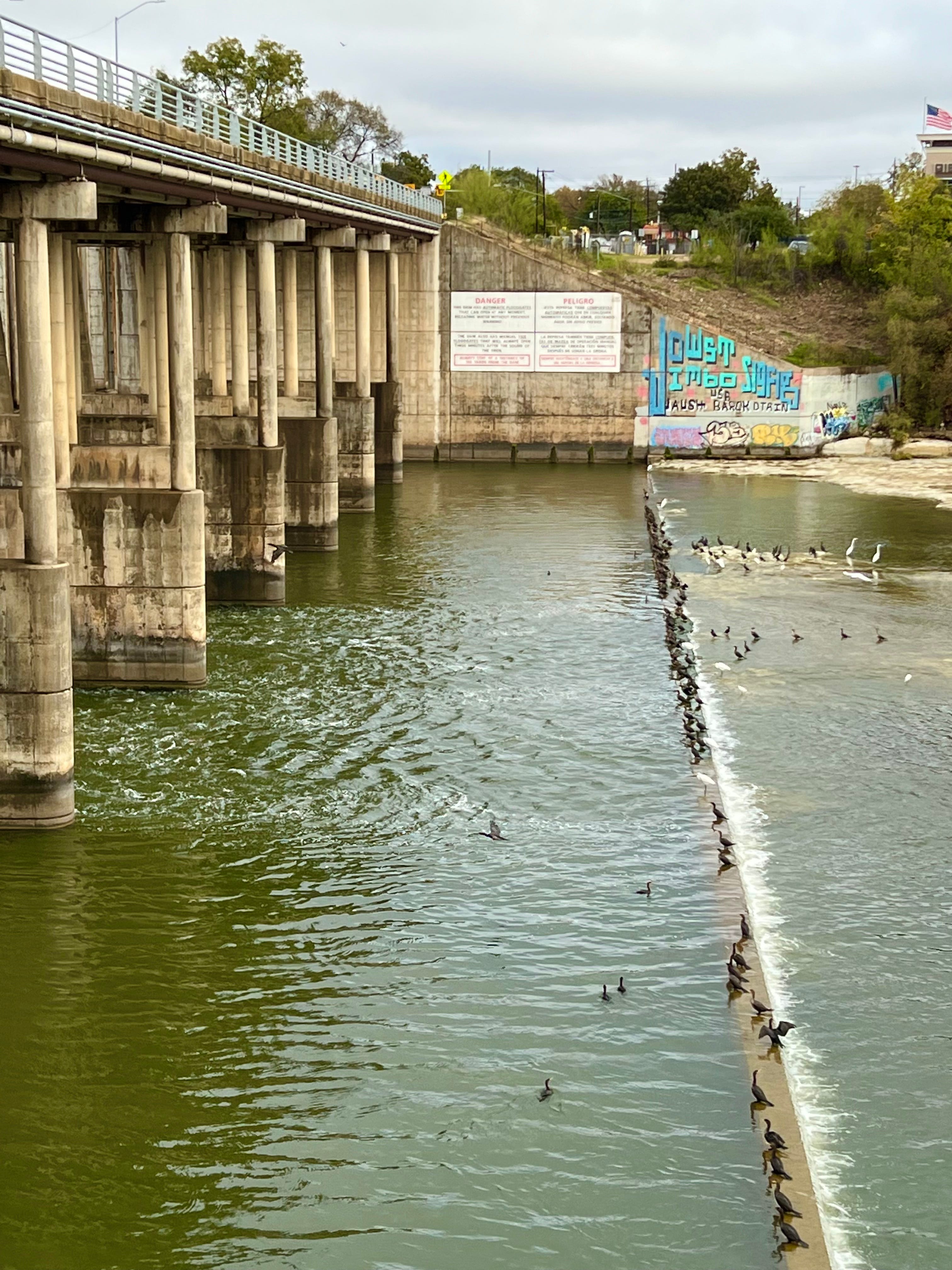 When we got back, it rained all week through Thanksgiving, culminating in a big thunderstorm Friday night. The wind finally cleared the clouds, and my visiting son and I went for an urban trail run Saturday morning. On the spillway of the dam we witnessed a massive gathering of urban waterfowl: cormorants, egrets & herons waiting for the rush of water to flush the big fish from the bottom of Town Lake. And on the way, we passed those shelters on the shoulderless road.