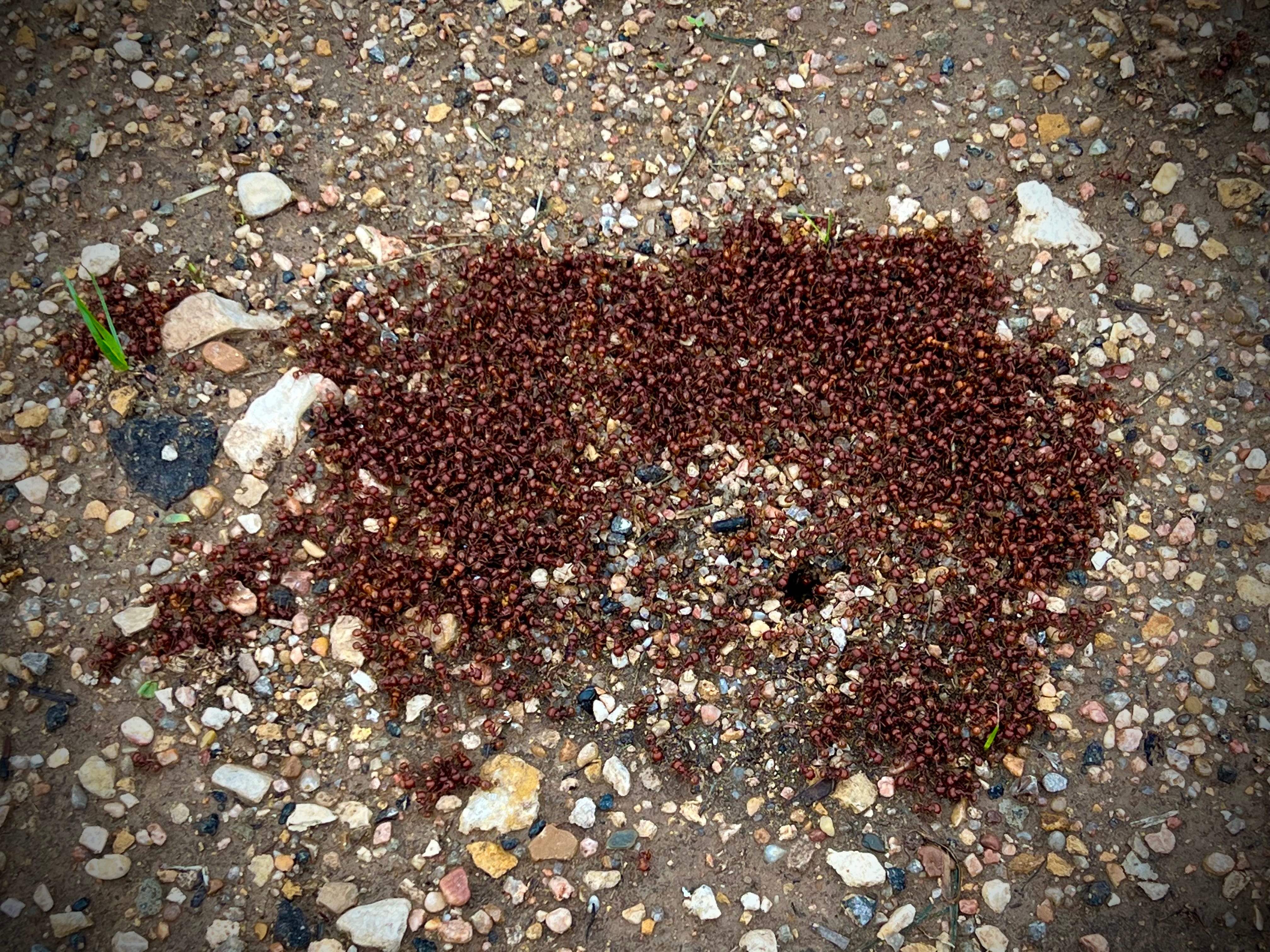 We ran on. Toward the end of the run, I noticed this clump of harvester ants gathered around the entry to their subterranean lair, even closer to the edge of the roadway than those shanties. Hundreds, maybe thousands of ants, huddling in the cold. They must have been flooded out by the storm that woke us before dawn. Another species that seems to share our proclivity for denuding its domain of all other life, if on a more manageable scale. And as I got to thinking later about whether that kid was the descendant of indigenous peoples who got dispossessed by our idea of how to manage the land in common, I found myself wondering when those practices will bring the storms that flood us out, to live in the ruins of the world we partitioned.