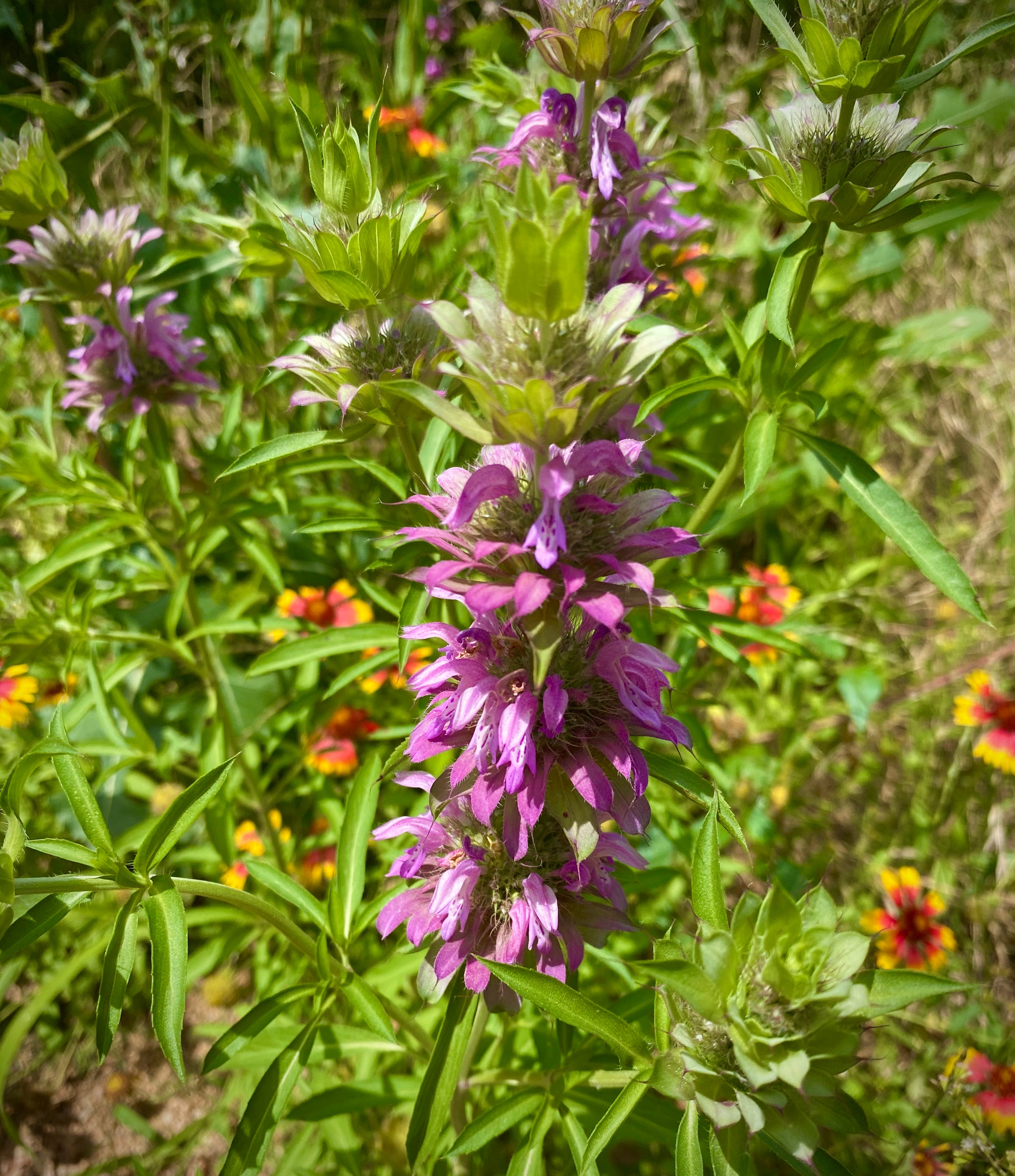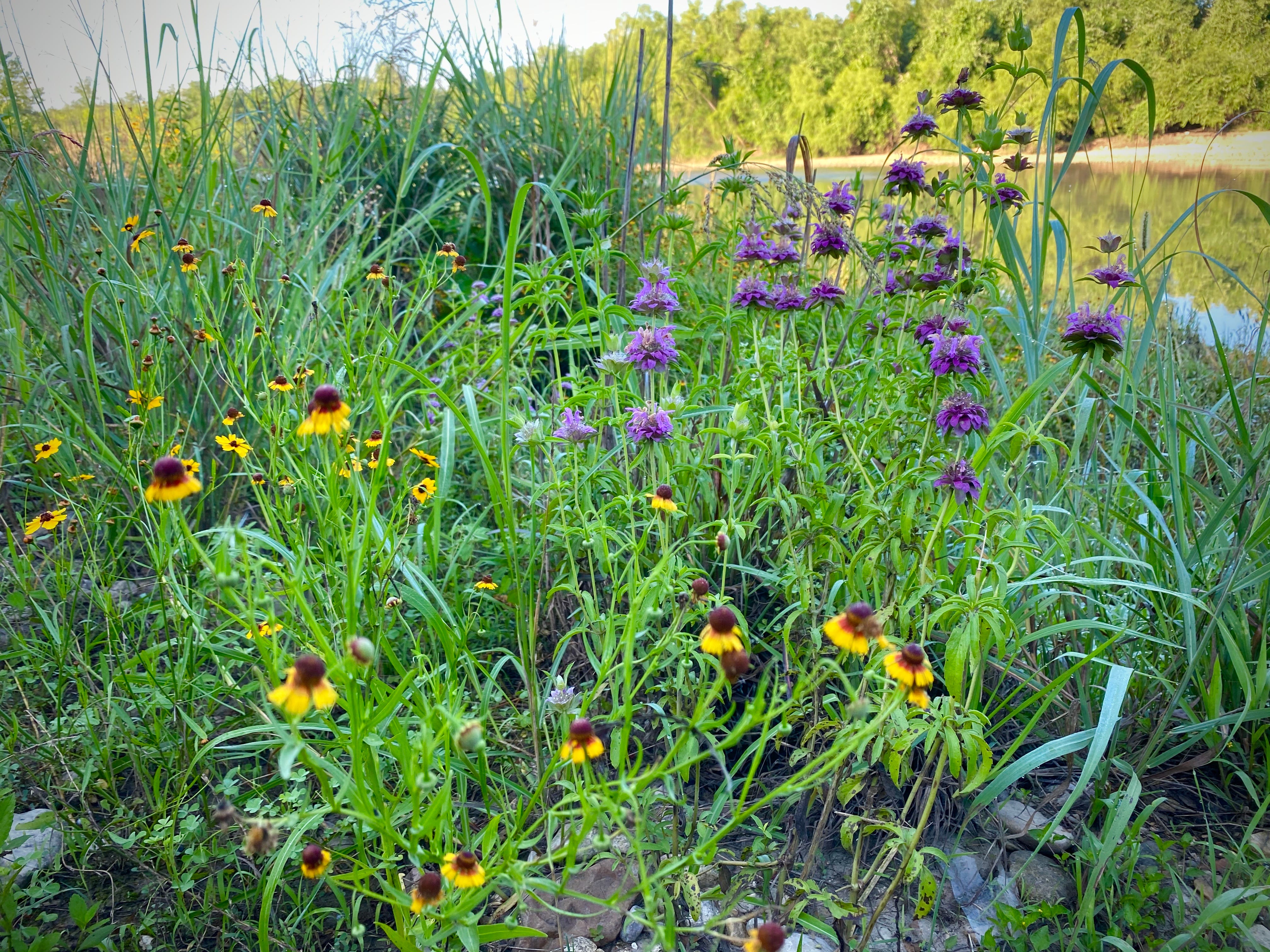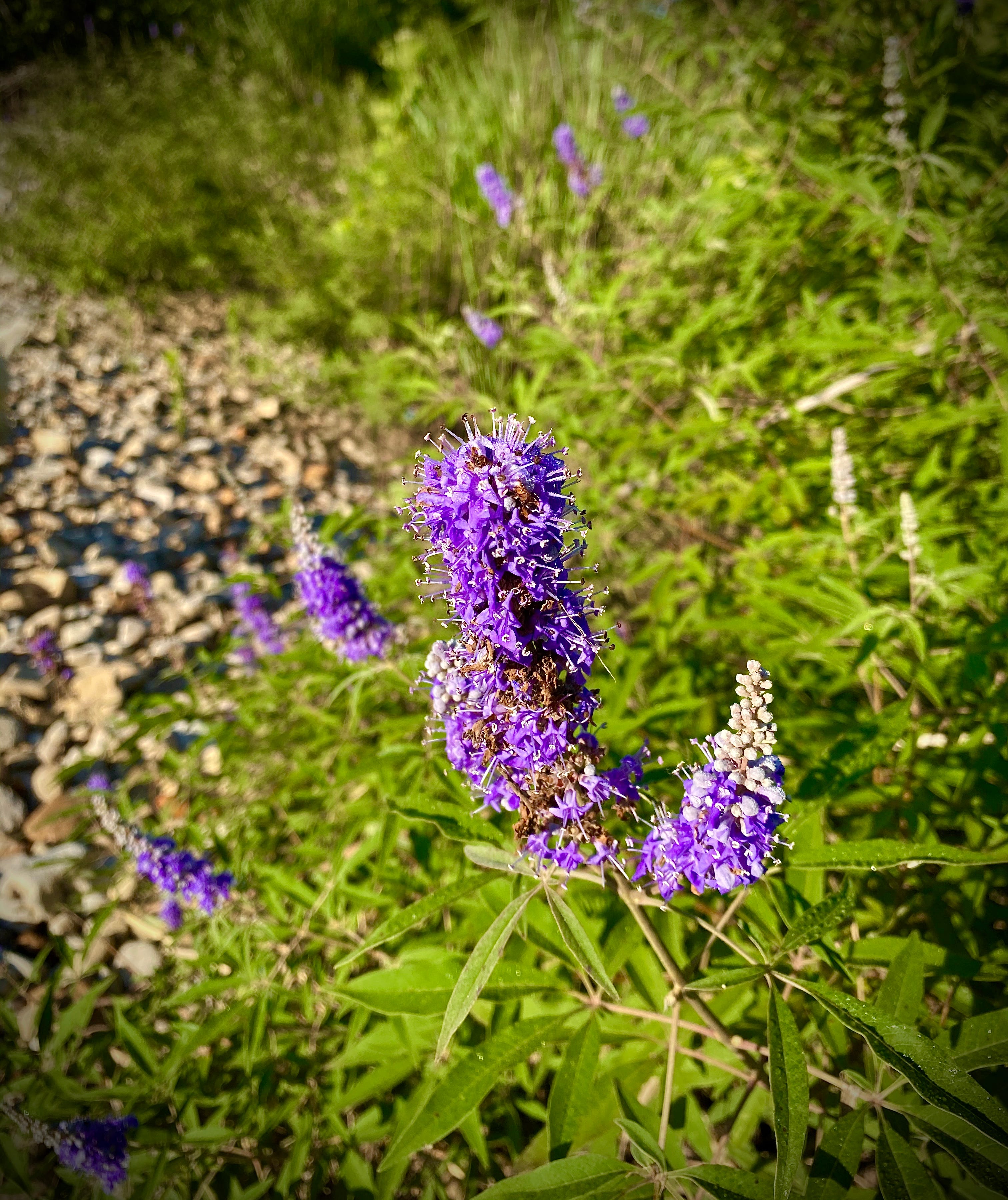 Baby and I walked down to the river Saturday morning, the first time in a couple of weeks. We have had nice storms lately, and the foliage along the river is super lush. Even as I laugh about grackles taking over from us, the native plants that have taken over the rocky beach near our place are the real deal, growing in what used to be a spot where they would dredge the gravel to build those streets and office towers. We’ve done a little bit of guerrilla gardening down there, and I like to think that has contributed to all the big switch grasses, but mostly I think it’s just the natural process of how the land and water heal on their own with a little time and inattention. The horsemint has bloomed late this season, at the same time as the blue sages that grow in the rock behind the button bush, splattering the banks in beautiful dollops of vibrant purple.