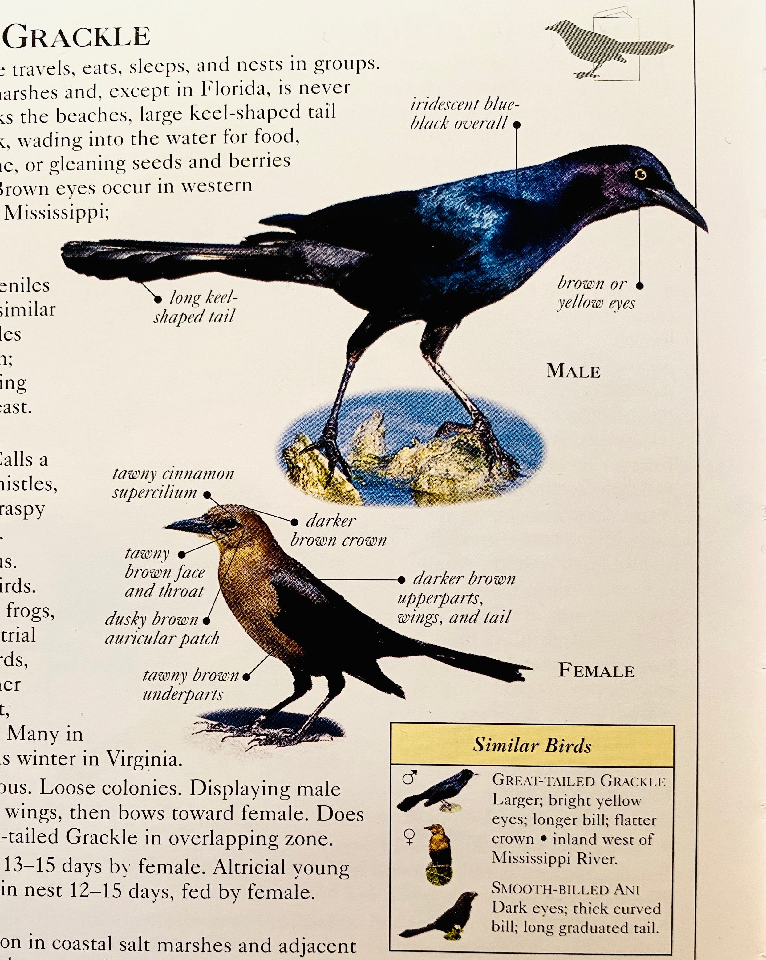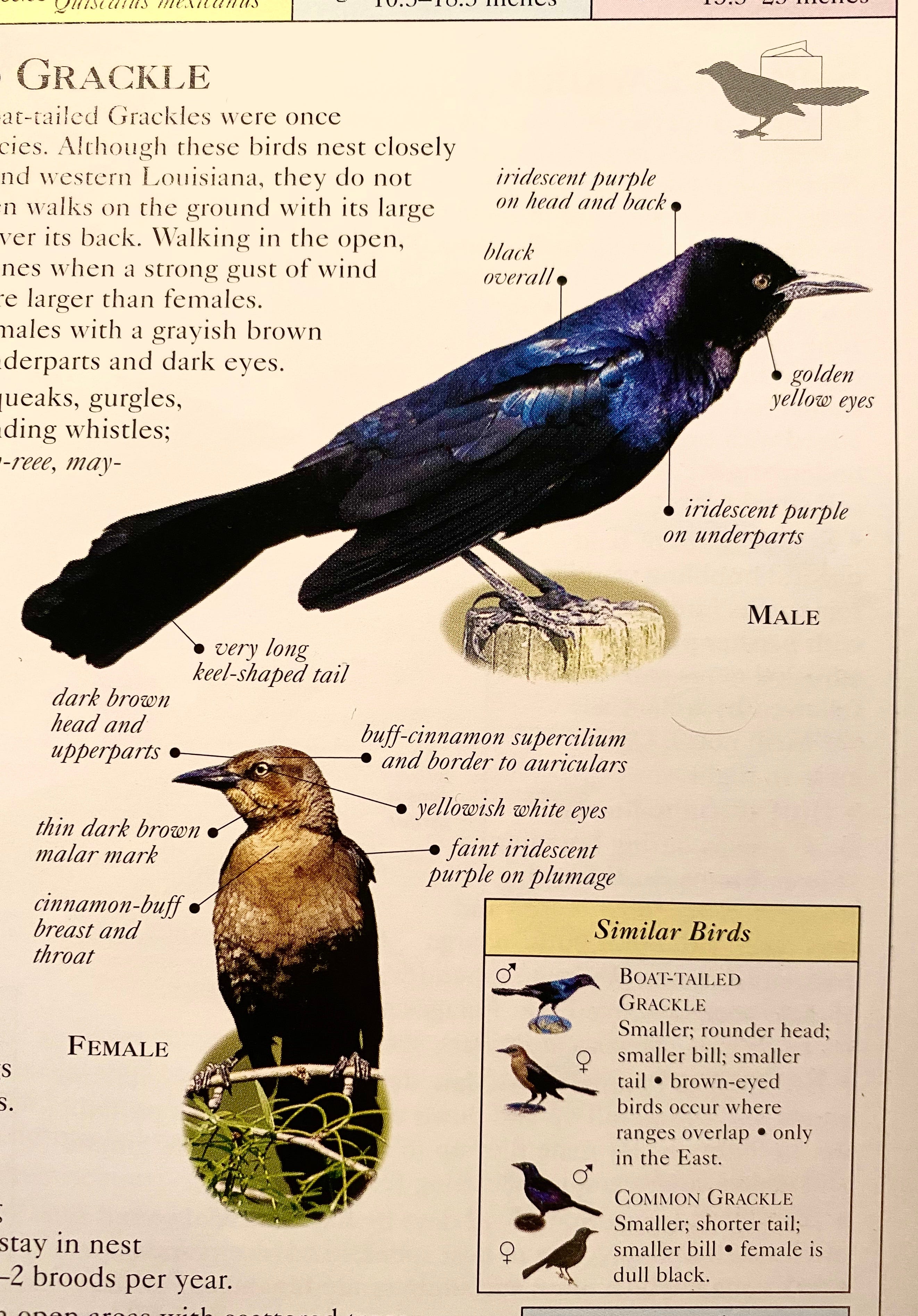 The bird books reveal several variants of Texas grackle: boat-tailed, great-tailed, common, and they are often found hanging out with another blackbird, the cowbird. The first two are the ones I am used to seeing around here, the ones the ornithologists consistently describe as gregarious, thieving, promiscuous, polygamous, noisy, and highly territorial. The males have a proclivity for insane competitive peacocking and even wrestling with their peers, even when there are no females around. They are basically omnivorous, and their flocks can number in the tens of thousands.