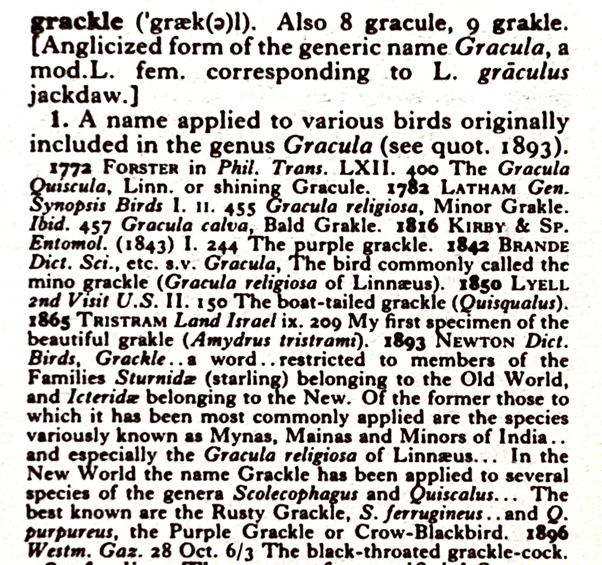 People used to call them jackdaws, after the Scottish crow “noted for its loquacity and thievish propensities,” according to the OED. The taxonomic name for the family is Gracula, evidently the Latin word for jackdaw, a word that would make an excellent Austin band name.