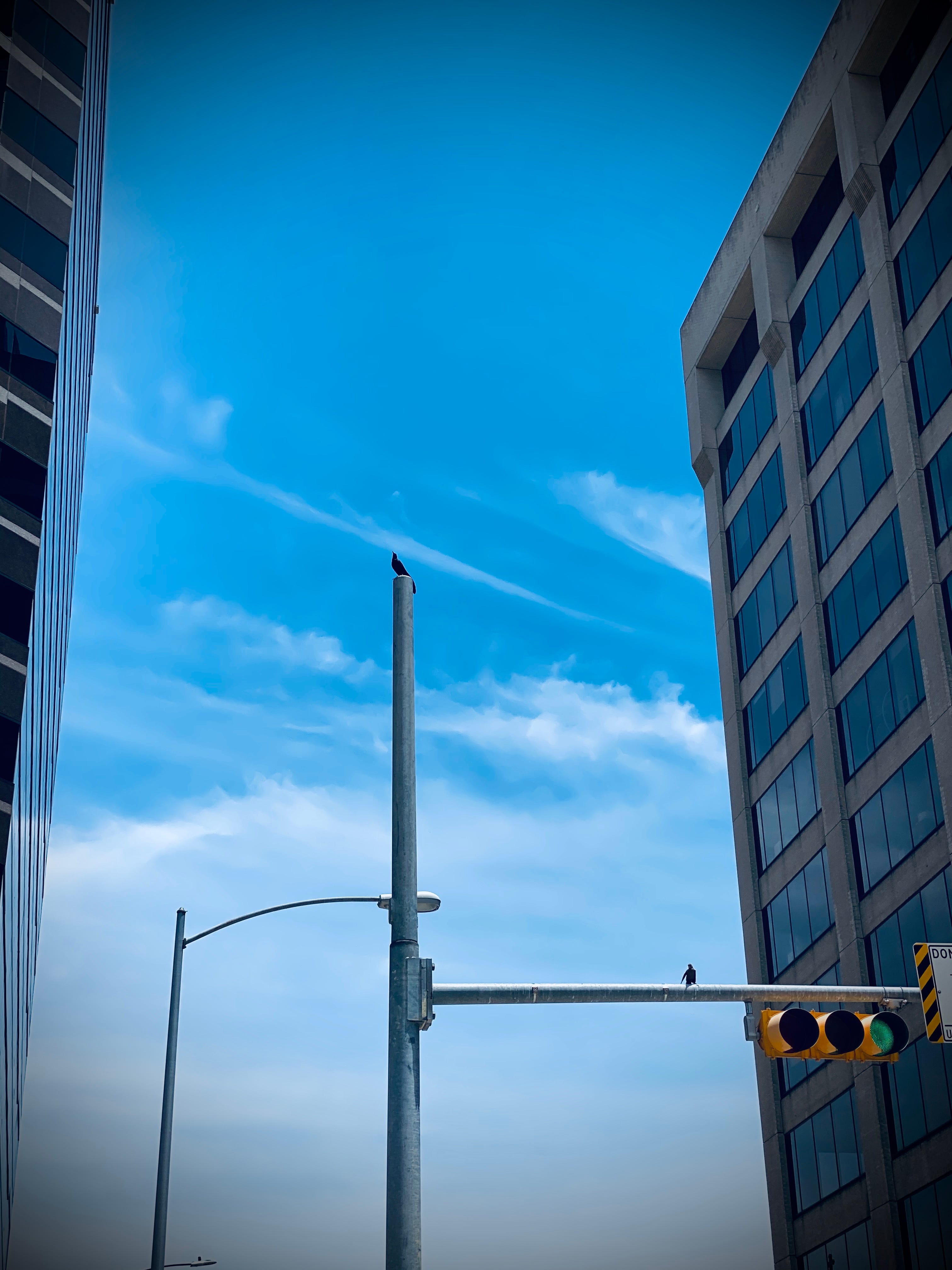 Not having to worry about active shooters is one of the nicer side effects of the pandemic, and as I parked my truck and went to the meter on the mostly abandoned street I felt like kind of a sucker, wondering if the meter readers are even working their routes these days. But as I put the sticker on my windshield there under the shade of a sad little spreadsheet tree, I felt the talons combing my hair before I even heard the familiar squawk. I had parked right in the territory of a nesting pair of grackles, and they tag-teamed me with dive bomber runs all the way to the corner, more aggressively even than the red-winged blackbirds who were the nemesis of my youthful runs growing up in the Midwest.