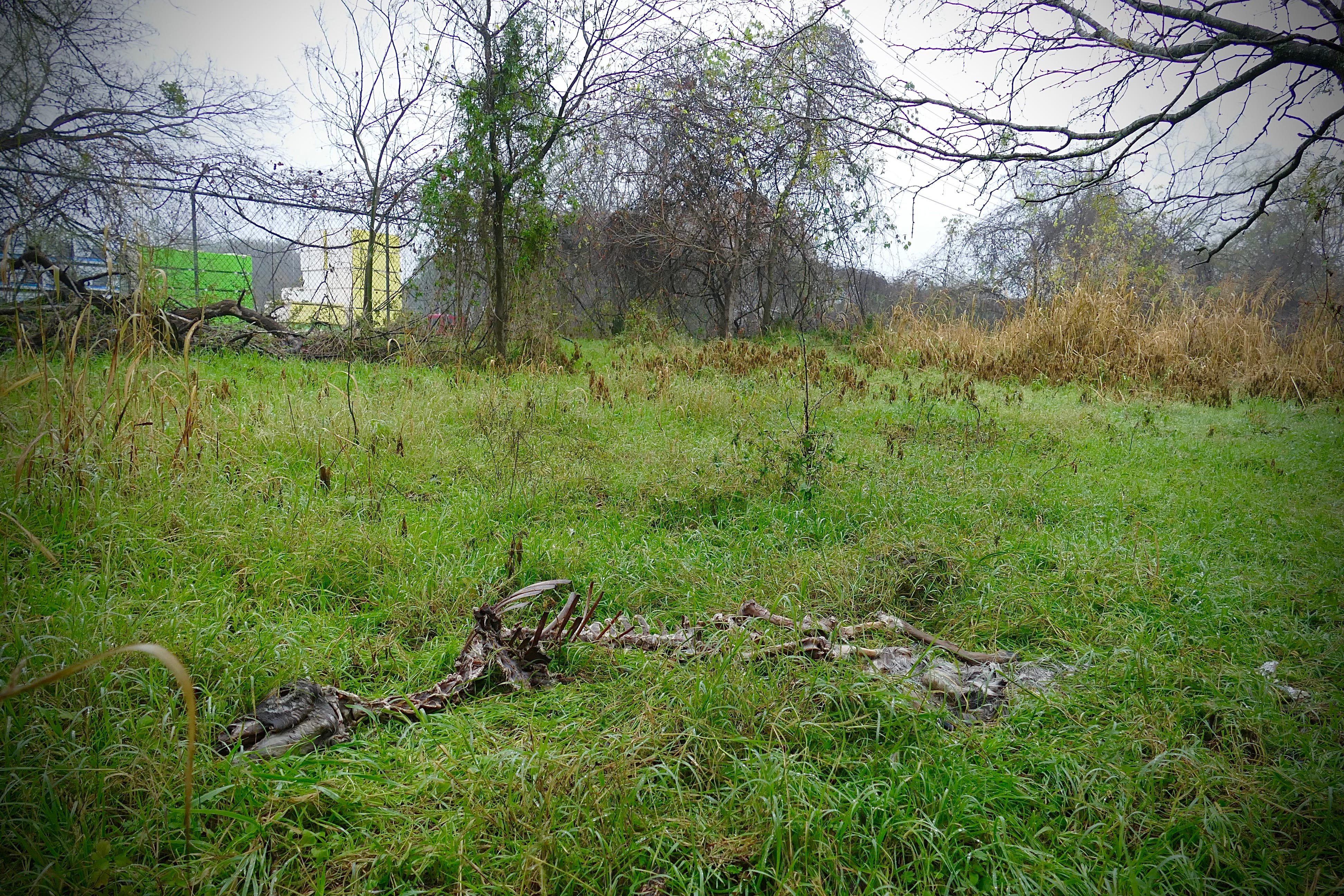 The morning of the solstice, at day break on Saturday, right after the rain finally stopped, the black mouth cur and I went out for a walk on the paths those coyotes travel. We followed the right of way behind the door factory, a path that once led to a ferry landing but now is only used by wild animals and telecommunications cables. I’ve spent most of the year writing a book about the things we’ve seen and learned rambling these zones, which ironically meant we haven’t had much time for longer walks in them. And it always amazes me how quickly you can step off the pavement and into the feral. Right behind the gypsum yard, as some dude loaded pallets of drywall on a flatbed truck, we encountered our first deer carcass of the season. Wet ribs sticking out of the brome, with fur still on the head, another clump around the hind legs, and scatterings of white fur nearby. A couple of days old, probably, with most of the meat picked off the bones by scavengers. Perhaps the scene that preceded is there on some backlot security camera footage no one has watched but the bots.