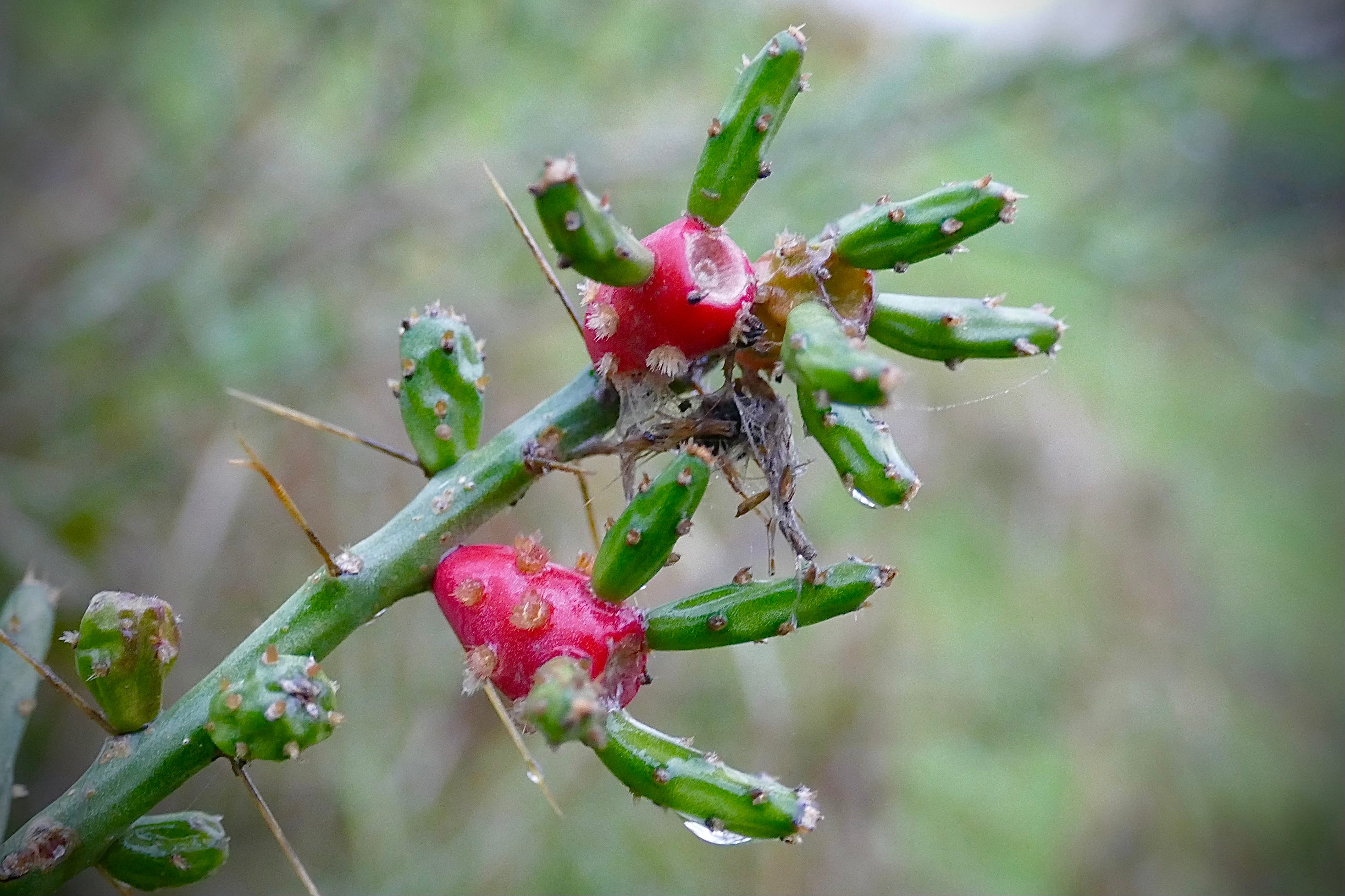 If you look up Cylindropuntia leptocaulis, the pencil cactus sometimes called Christmas cholla and more commonly known down here as tasajillo, the botanical entry will likely note what becomes obvious as soon as you read it: that the plant, covered in spines, both the long thick kind that repel you from even coming close, and the smaller clusters of fine spines that would likely stick in your throat if you tried to eat the enticing little bulbs, is deer resistant. That explains why it flourishes in patches in the unfenced dry uplands at the edges of the city, despite the abundance of hungry ruminants. It’s less common in the floodplain. I’ve only found one specimen in the acres of empty lots behind the factories around our home in East Austin, an individual plant that has been there longer us, fifteen years now, growing on the grade between an irregularly mowed industrial park and the riparian woods. When I see it this time of year, it always makes me think of Frazer’s decoding of the story of Balder and the mistletoe in The Golden Bough. A solstice plant that encodes winter’s paired promises of death and rebirth. Even if, in the case of tasajillo, that’s not really the deal.