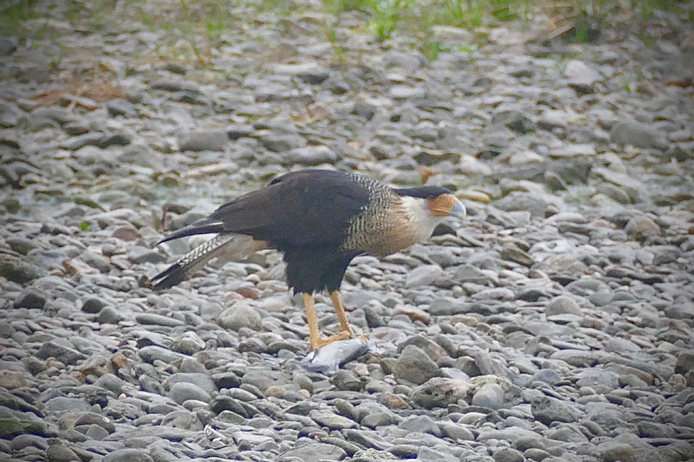 On the opposite bank, a lone caracara tried to figure out how to use that epic, almost self-parodic beak to eat the best parts of a nice-sized fish it had in its talons, likely one it had found grounded after the rainwaters receded. The ospreys, like the one we saw a little further along the river, are the ones who take the fish from the water.