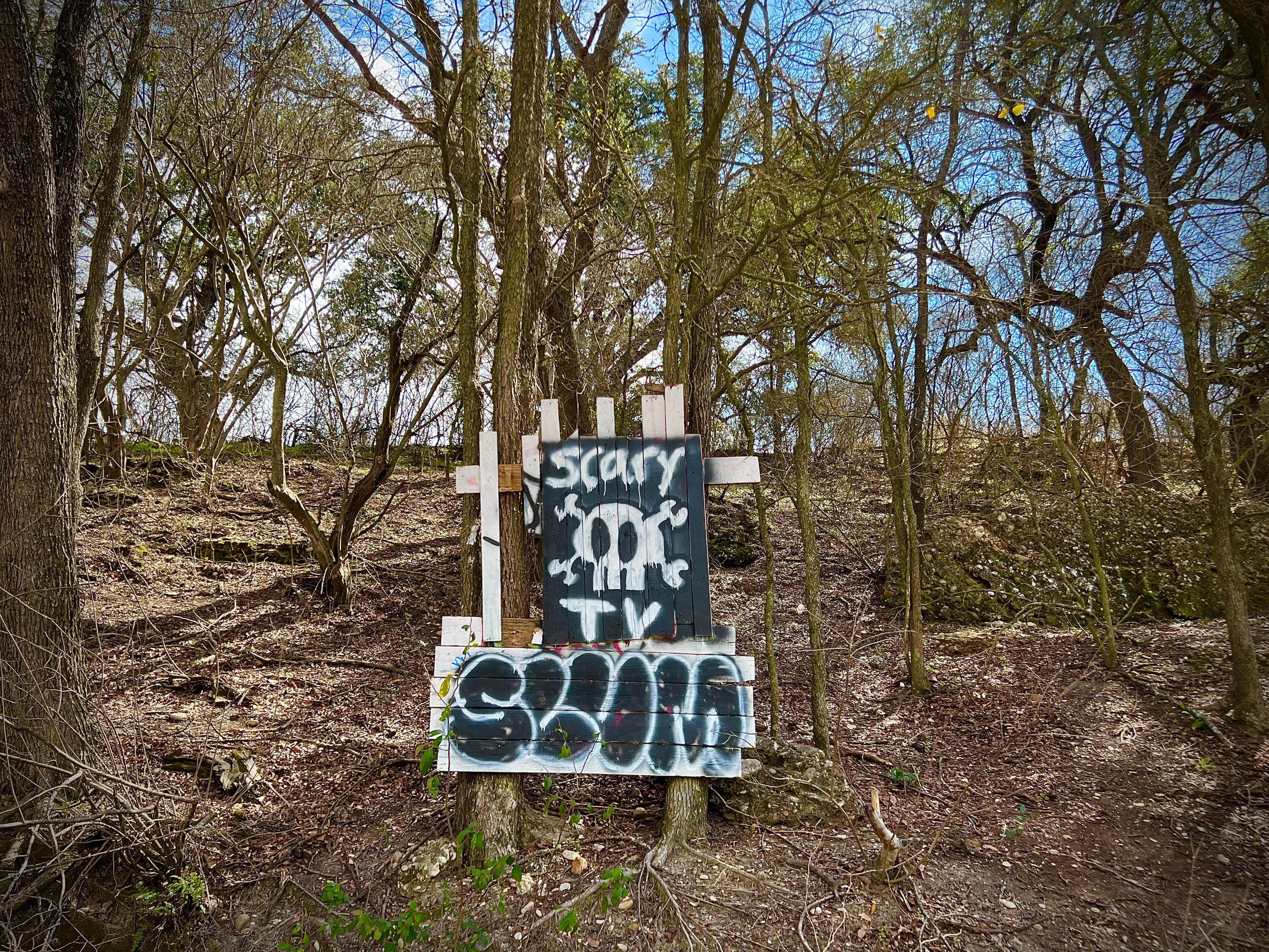 When the arboretum trail crosses the creek, it traverses the bluff up to a little spot behind the community college campus and the municipal golf course where you can have close encounters with the nature that was here long before us, in the form of three majestic oaks that each must be hundreds of years old. The most ent-like trees you could ever see in Texas, there in a spot that until recently was hidden in plain sight, off the curb of a side road at the edge of town, marked only by a metal cable draped between two short poles.