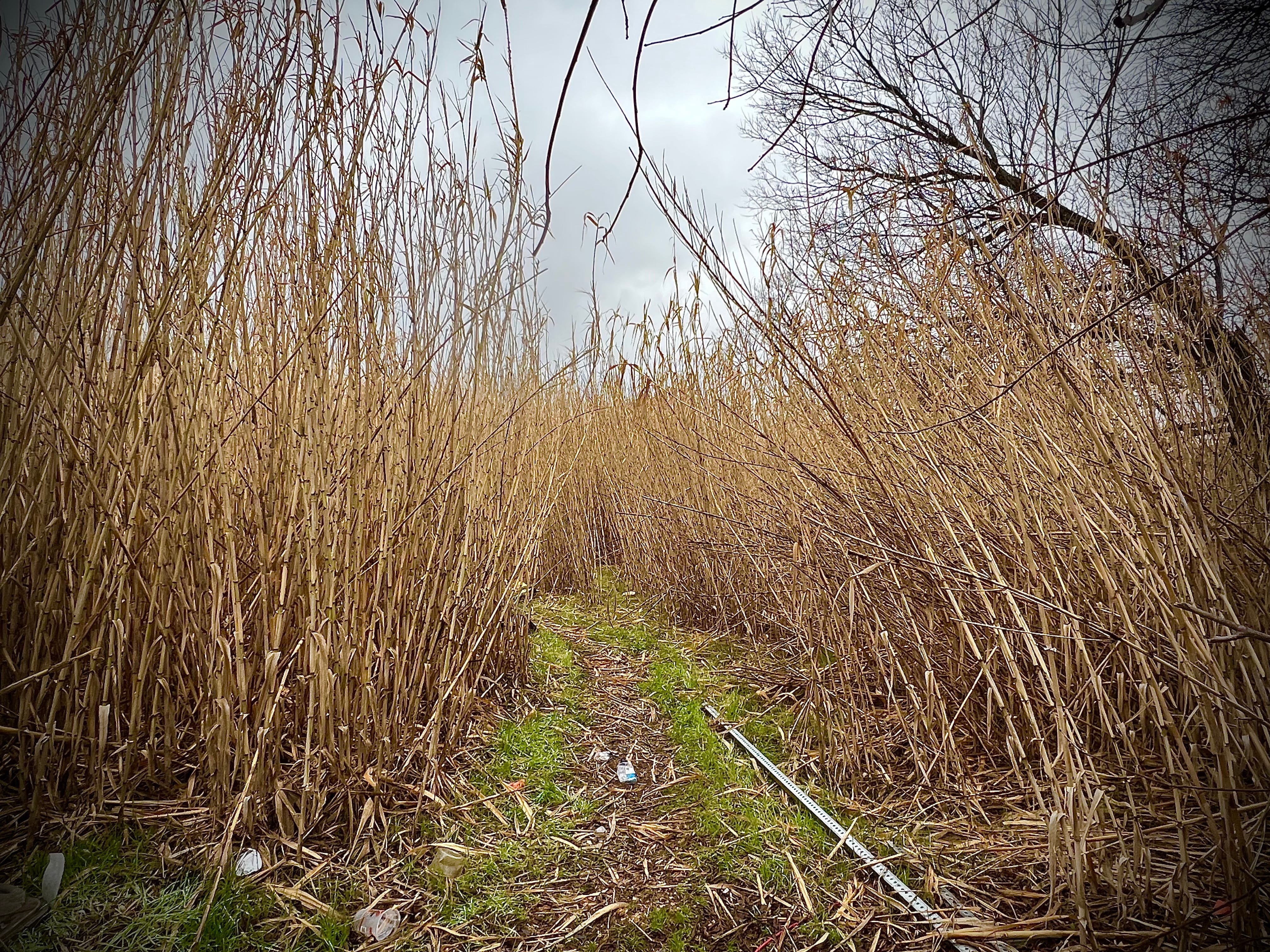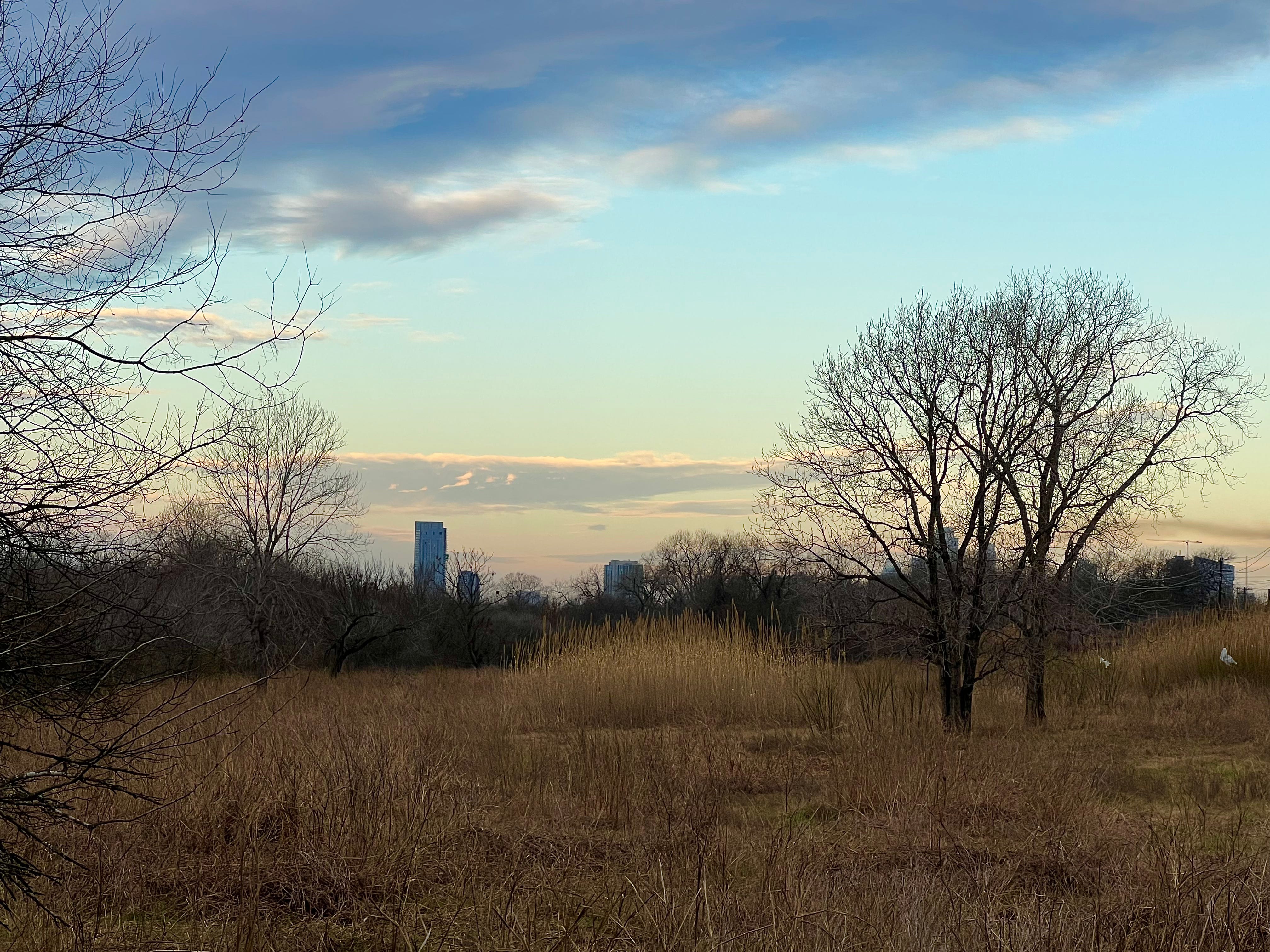 That morning the East Austin Street Retriever and I had headed out right at daybreak, walking into the empty lots behind the dairy plant, an area we had not explored much for many months. We saw scat that suggested feral hogs have moved into the area, something we hadn’t encountered on this side of the river before. The invasive grasses that dominate that field were all at peak dormancy, the Johnson grass mostly broken down to the ground while the tall cane got its edgeland Wyeth on, and an autumnal palette dialed up with the rising sun. At the far end, where the loop road curves around to run under the bridge, and the cane grows so thick that the desire paths of the drifters turn it into a labyrinth, we could see the huge blue tarps of a new camp that has settled in over the winter. And when we turned around to look back where we had come from, for the first time you could see the new towers of technocapital rising up over the treeline.