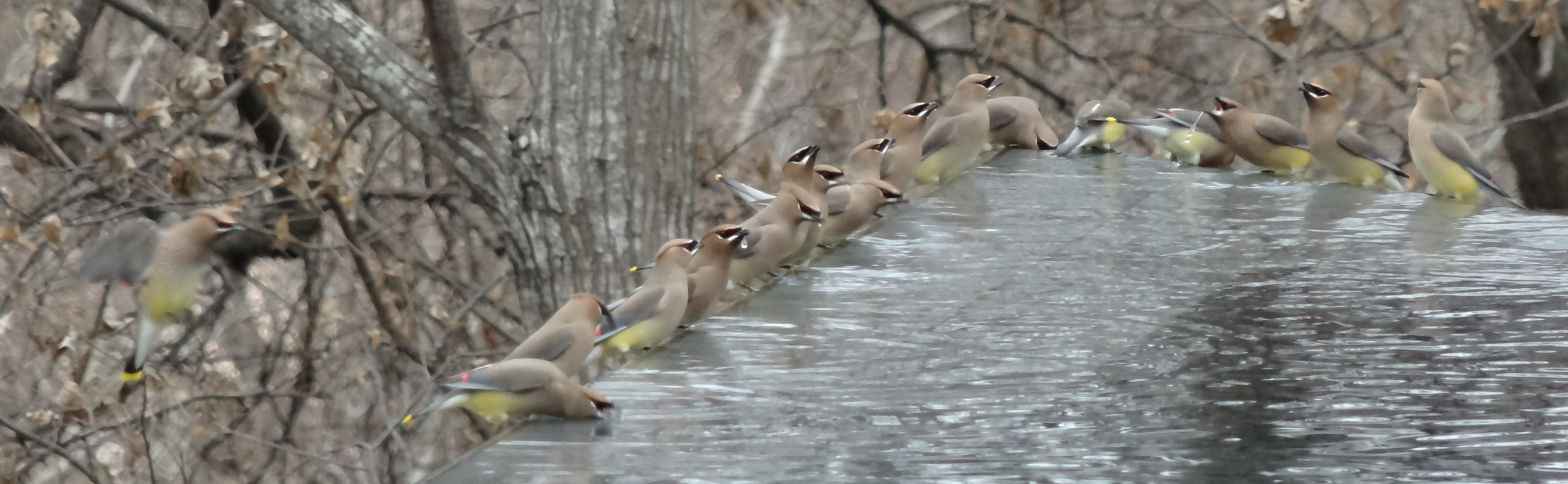 For those who made it to the end, here’s a fave photo from seven years ago this week of a flock of cedar waxwings making a boisterous water stop on the negative edge of our chlorine-free pool.