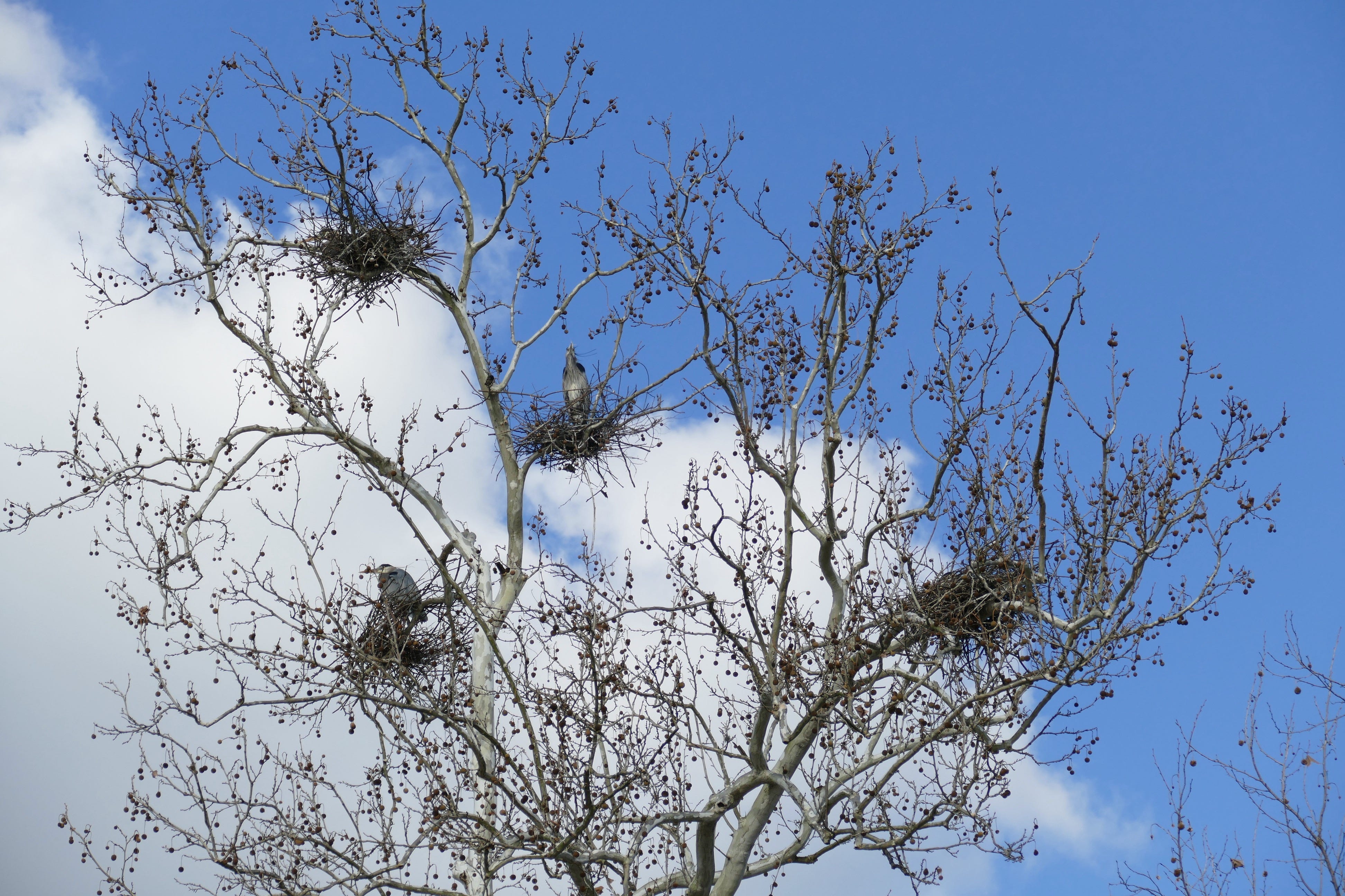 The birds don’t seem to mind, so far, from what we saw on our paddle this week. In the tall bare cottonwood that grows out of the island of trash below the head shop, the blue crankys have taken over and turned it into their own multifamily development, four birds warming their huge nests on a cool and windy afternoon in February.