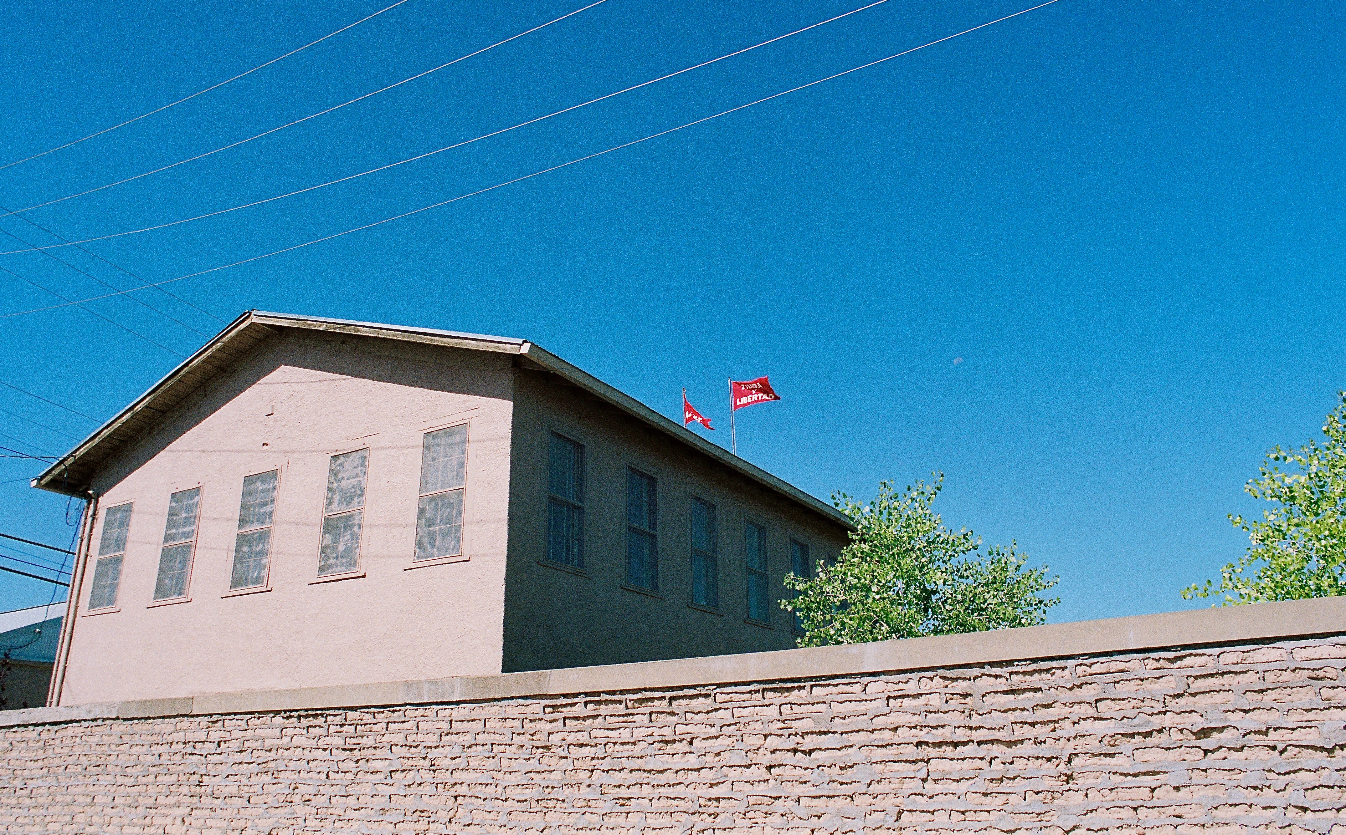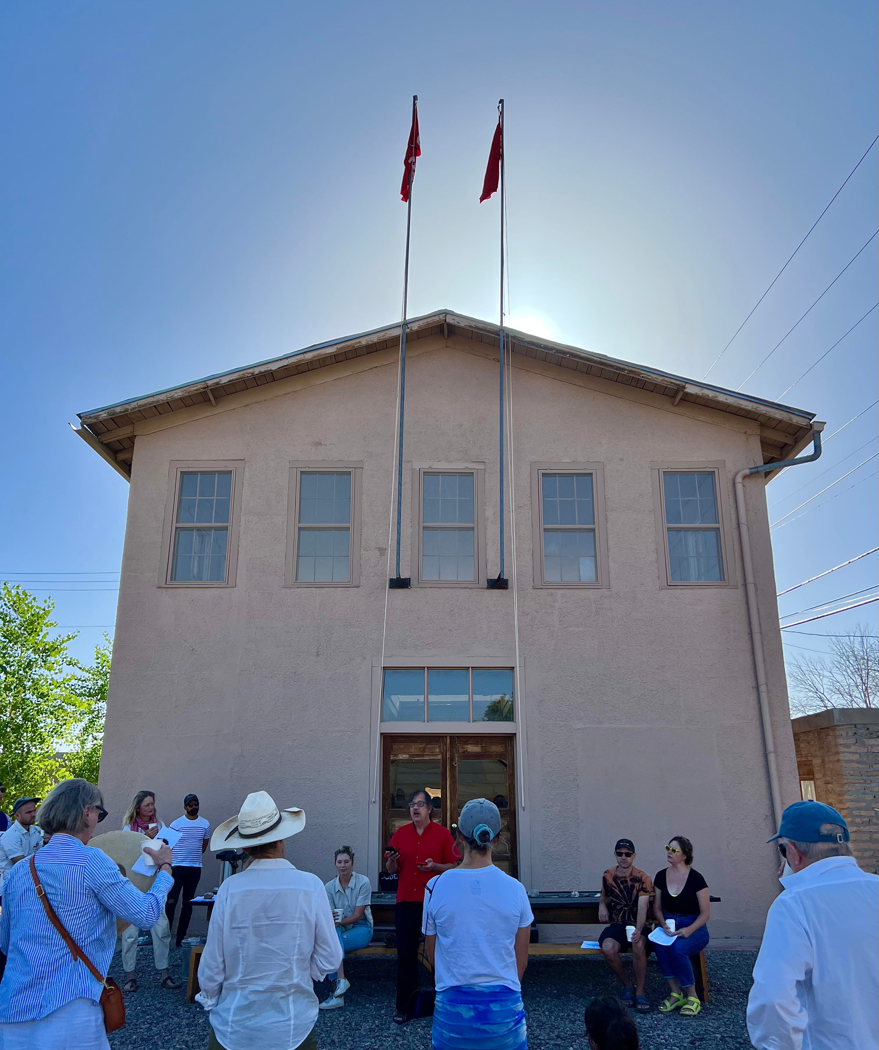 Last Saturday morning, after driving overland from Tijuana through Chihuahua and visiting other Magonista sites along the way, Pepe and Grant installed two newly hand-sewn Tierra y Libertad flags above the Block, Donald Judd’s residence in Marfa on the site of an old military compound, now maintained as a museum by the Judd Foundation. The event was part of the Agave Festival, an exceptional series of free public cultural programming curated by Tim Johnson and Caitlin Murray of the Marfa Book Co. in collaboration with the Judd Foundation and other community members and stakeholders. The Block has several buildings, including two large hangars Judd used for installations and his library, and an old quartermaster’s office where he and his family lived. That structure has two flagpoles out front from that former use, and the idea of inviting the Comité Magonista to put them to use for the first time in many years was genius. And perhaps more radically provocative than anyone involved anticipated.