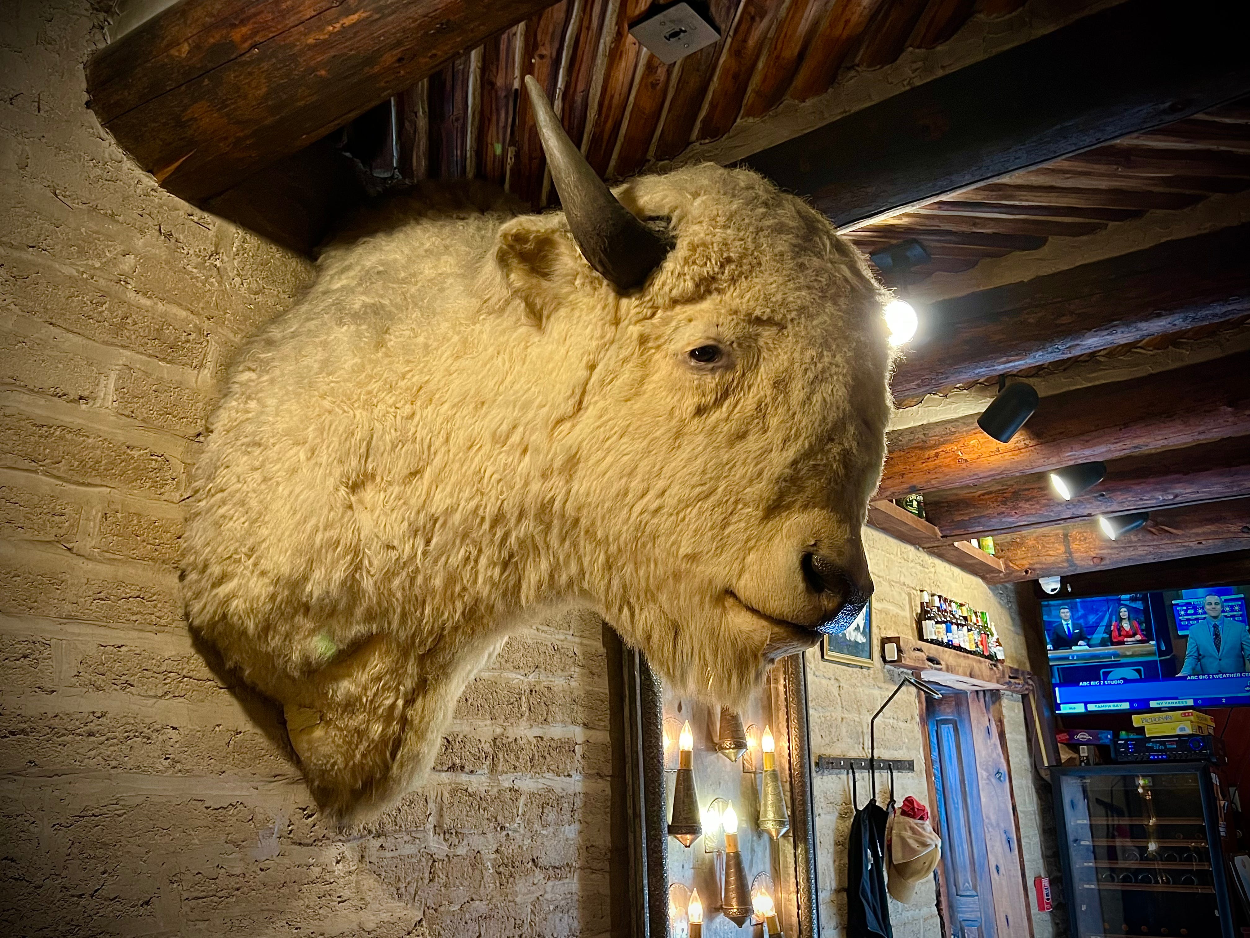 When we finally left the interstate in Fort Stockton, the ruins of the old military outpost of the conquerors shared the roadside with a Mad Max-worthy collection of Covid-vacated motels and C-stores. But once we got south of there, the cloud finally was behind us, and as we dropped down into the wedge of the Chihuahuan Desert that reaches into Texas, we found the greenest scene of our journey, a normally lunar landscape alive with desert plants in bloom, just days after some good rain. The enigmatic signs by the road marked our arrival in the Sierra Madera Astrobleme, which only when we arrived at our destination for the night did I learn was a giant crater left by a prehistoric meteorite. When I looked up from my phone, the dead white buffalo over the bar looked like it might once have known the real answers about the deep past and our ecological future, even as it made me think of the only good Ted Nugent song.